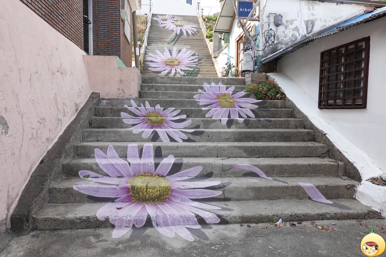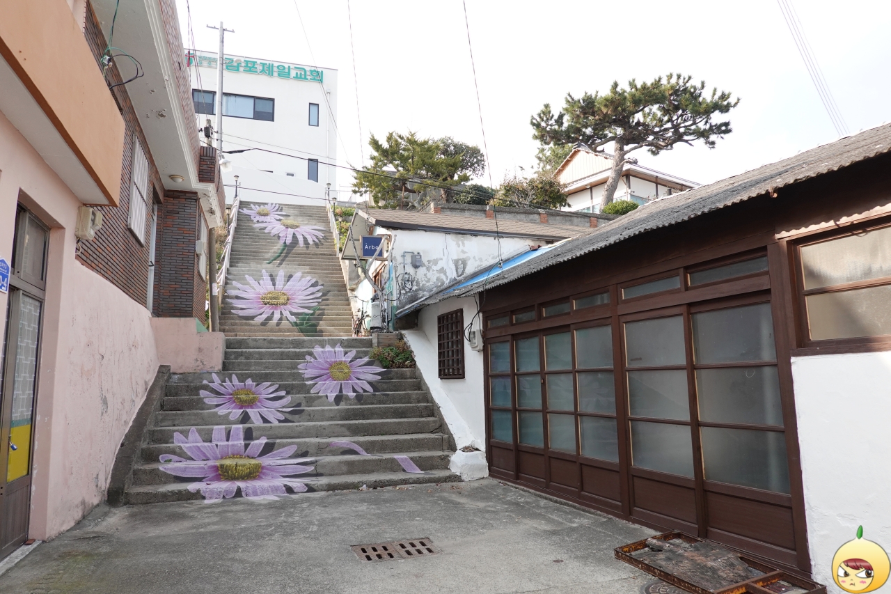 왔던 길을 다시 돌아서 나온다. 버스 정류장을 지나 감포공설시장을 향해 계속 걷다가, 평범하지 않는 계단을 보고 발길을 멈췄다. 랜선답사를 할 때 봤던 감포해국길 계단이다. 계단 주변으로 골목마다 다채로운 벽화가 있다고 했더니 정말 그런가 보다. 갈까? 말까?