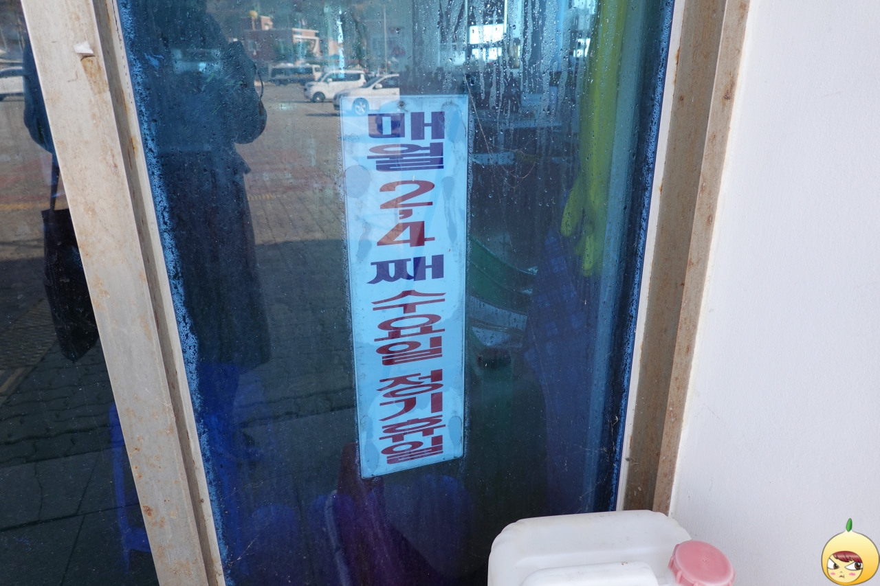 한적하니 좋아 좋아 하면서 걷다 보니, 어느새 수협활어직판장 앞에 도착을 했다. 여기도 영업 전인가 싶어 문을 열었는데, 아뿔사 문이 잠겨 있다. 그때 눈에 들어온 안내판, '매월 2, 4째 수요일 정기휴일'. 경주 감포로의 여행을 준비하면서 푹풍검색에 랜선답사도 마쳤는데, 가장 중요하다고 할 수 있는 정기휴일을 파악하지 못했다.
