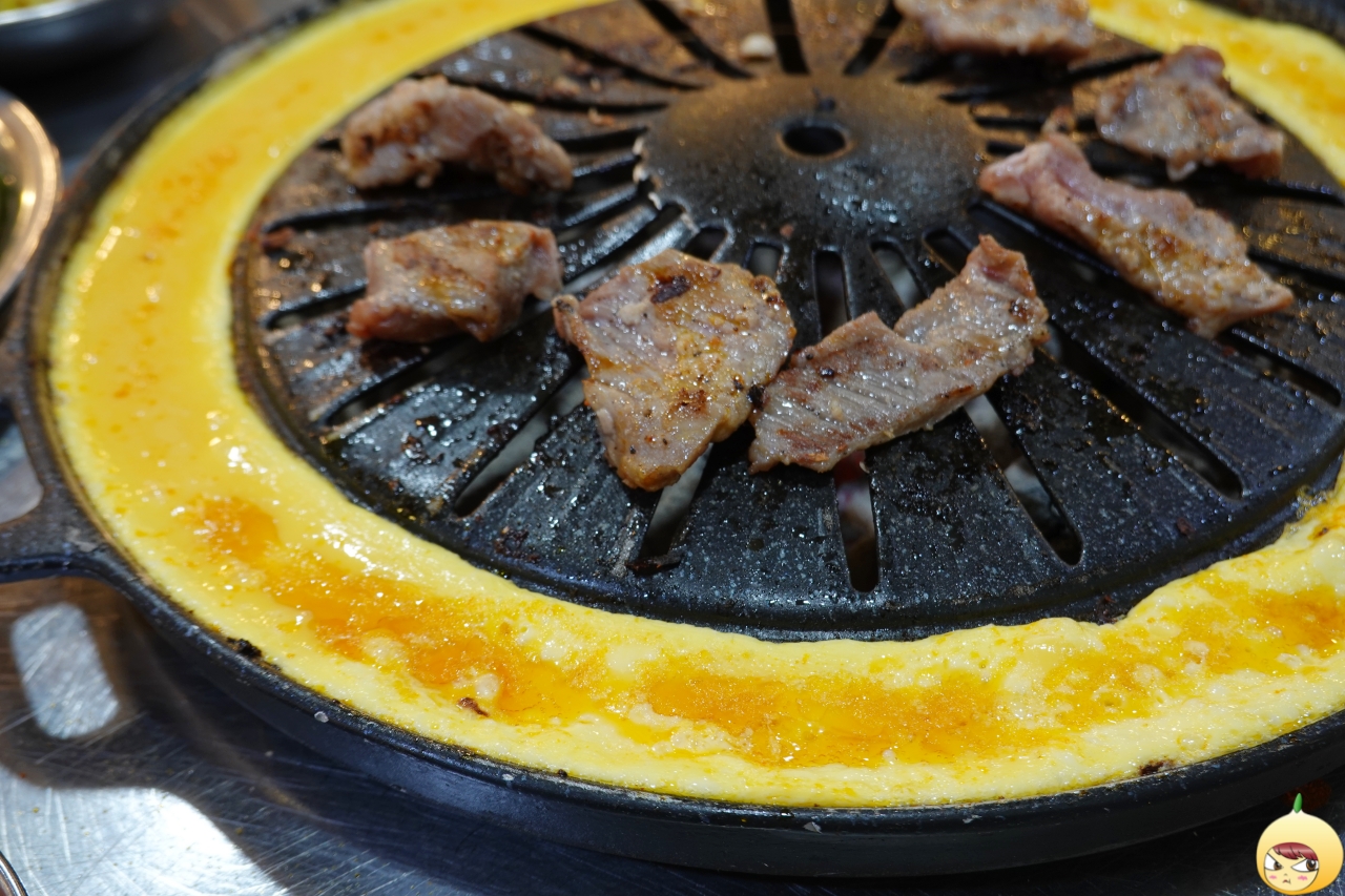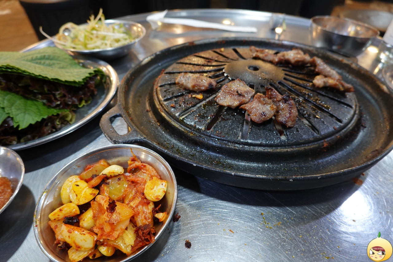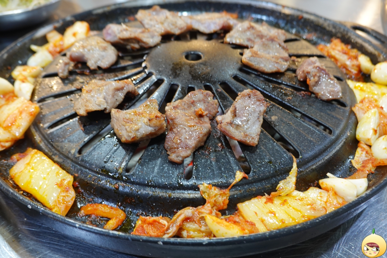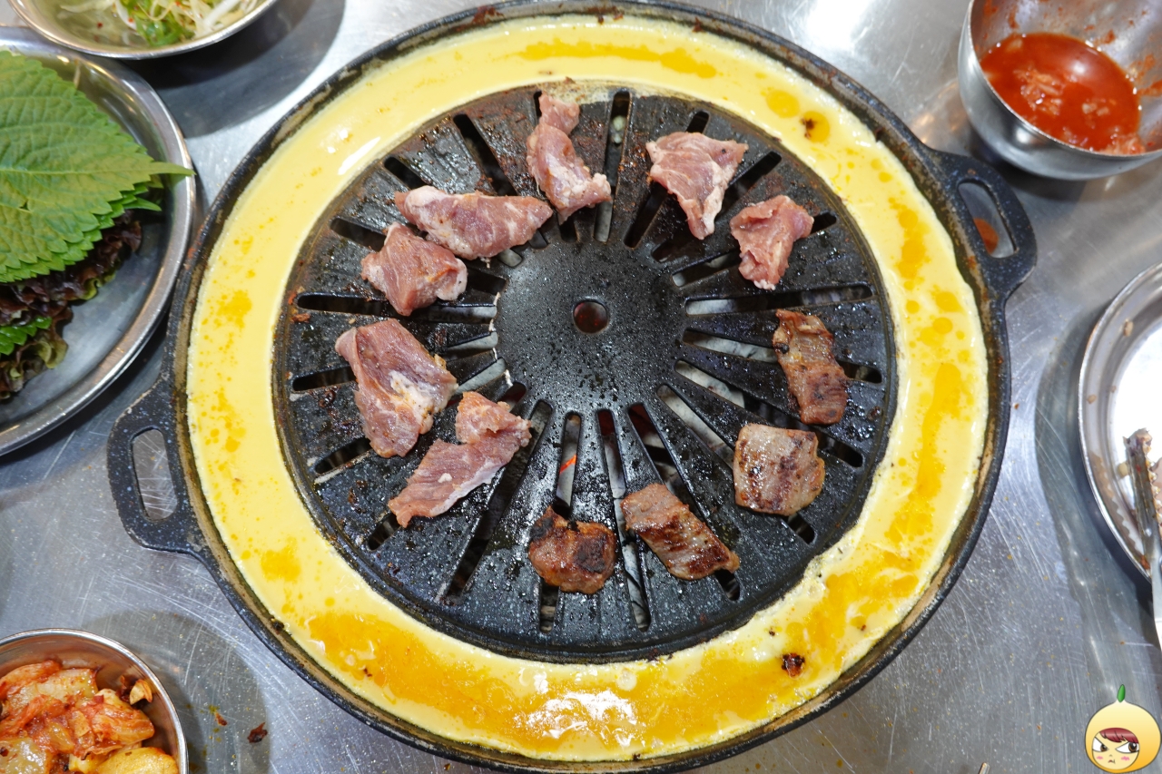 고기를 올리고, 참기름이 있는 공간에는 김치와 마늘을 넣으라고 직원이 알려줬다. 잘게 썰은 김치가 나온 이유는 이거였다. 여럿이 먹는다면 불판 가득 고기를 올려야 하지만, 혼자 먹으니 먹을만큼만 올린다. 대신 고기가 중간에 끊어지면 안되므로 시간차를 두고 올린다.