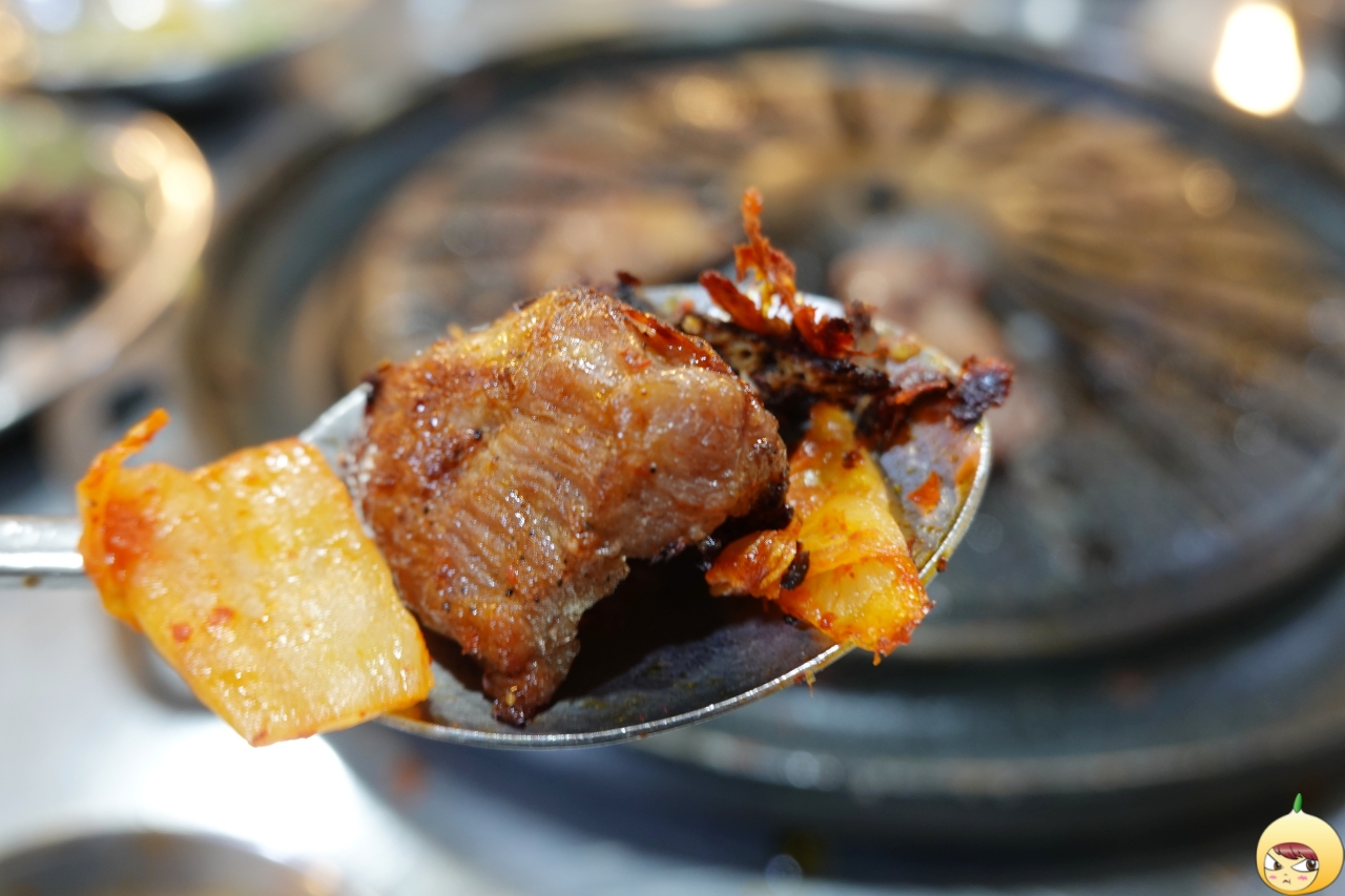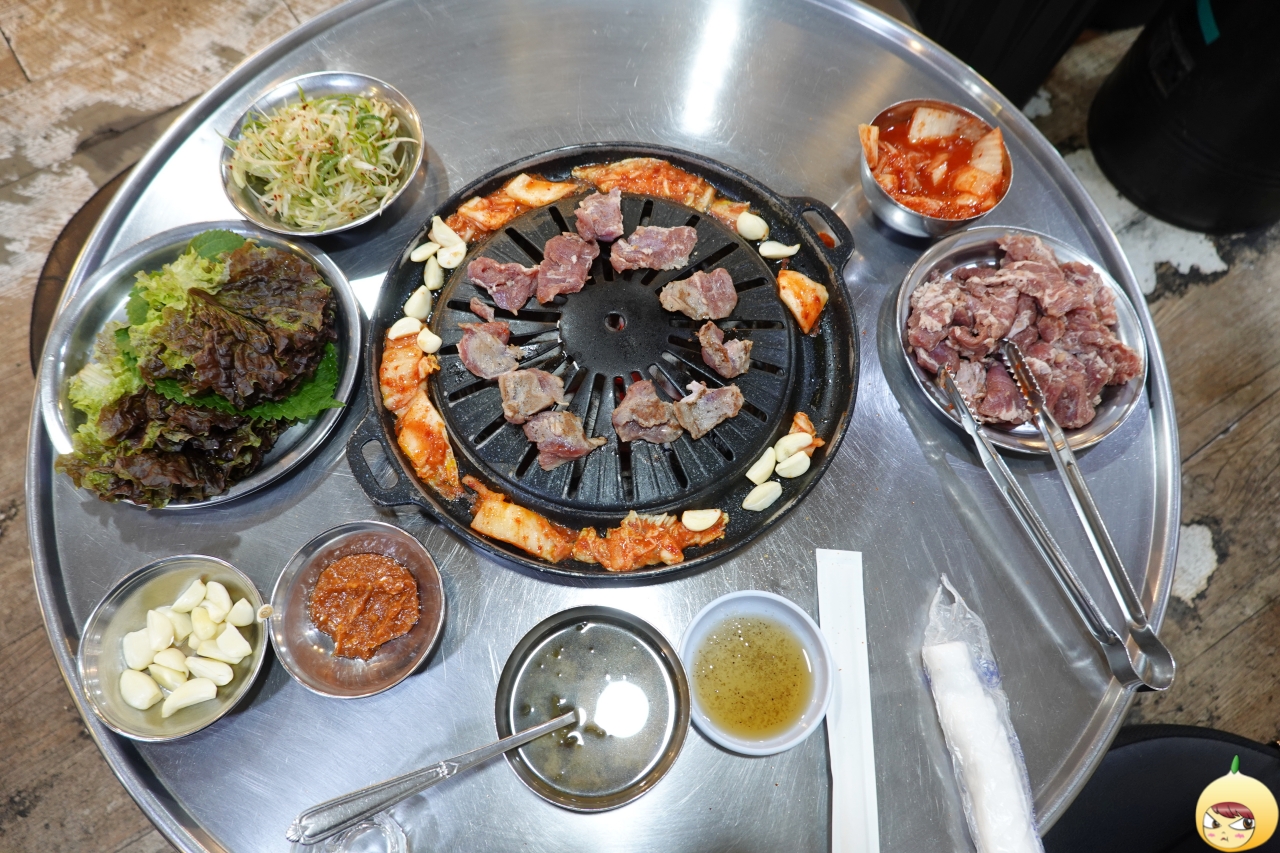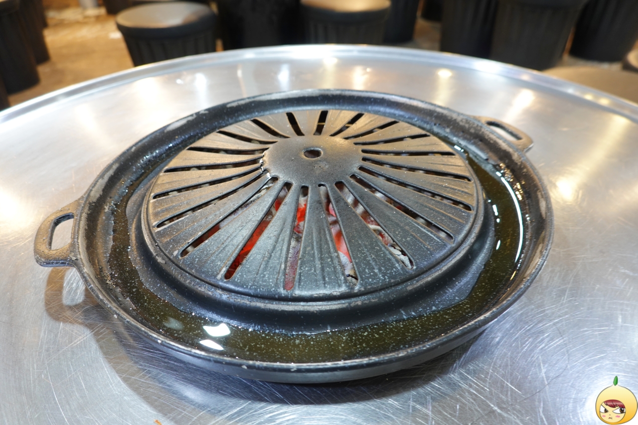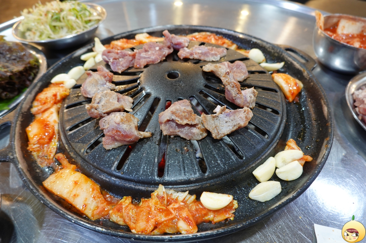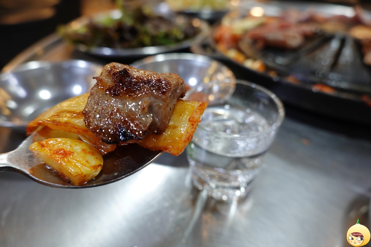 고기를 올리고, 참기름이 있는 공간에는 김치와 마늘을 넣으라고 직원이 알려줬다. 잘게 썰은 김치가 나온 이유는 이거였다. 여럿이 먹는다면 불판 가득 고기를 올려야 하지만, 혼자 먹으니 먹을만큼만 올린다. 대신 고기가 중간에 끊어지면 안되므로 시간차를 두고 올린다.