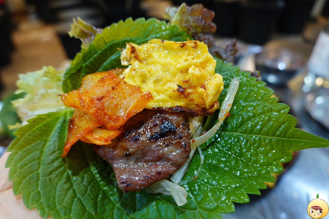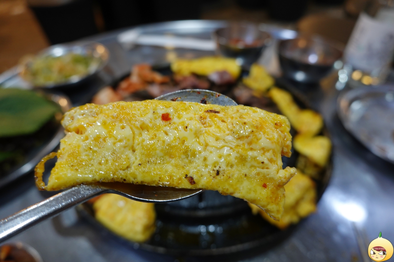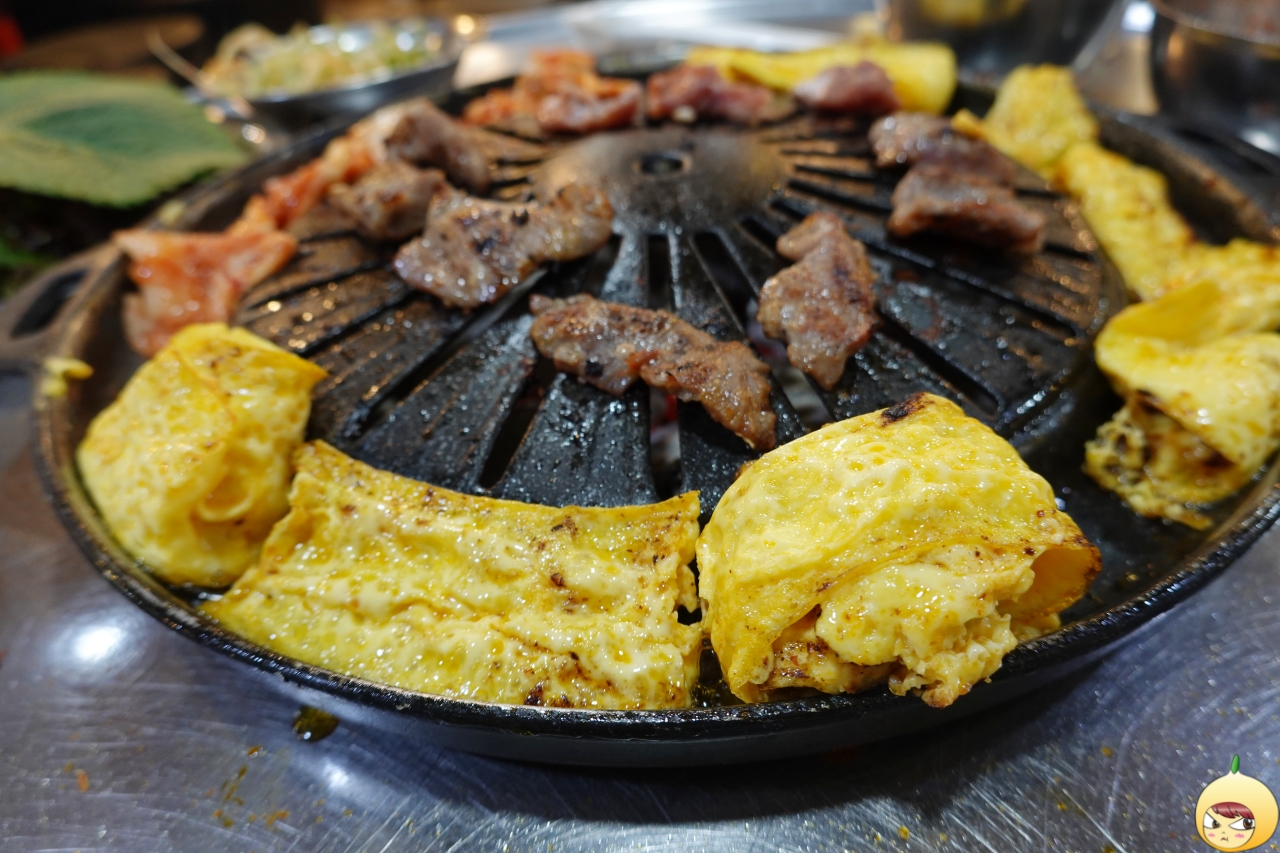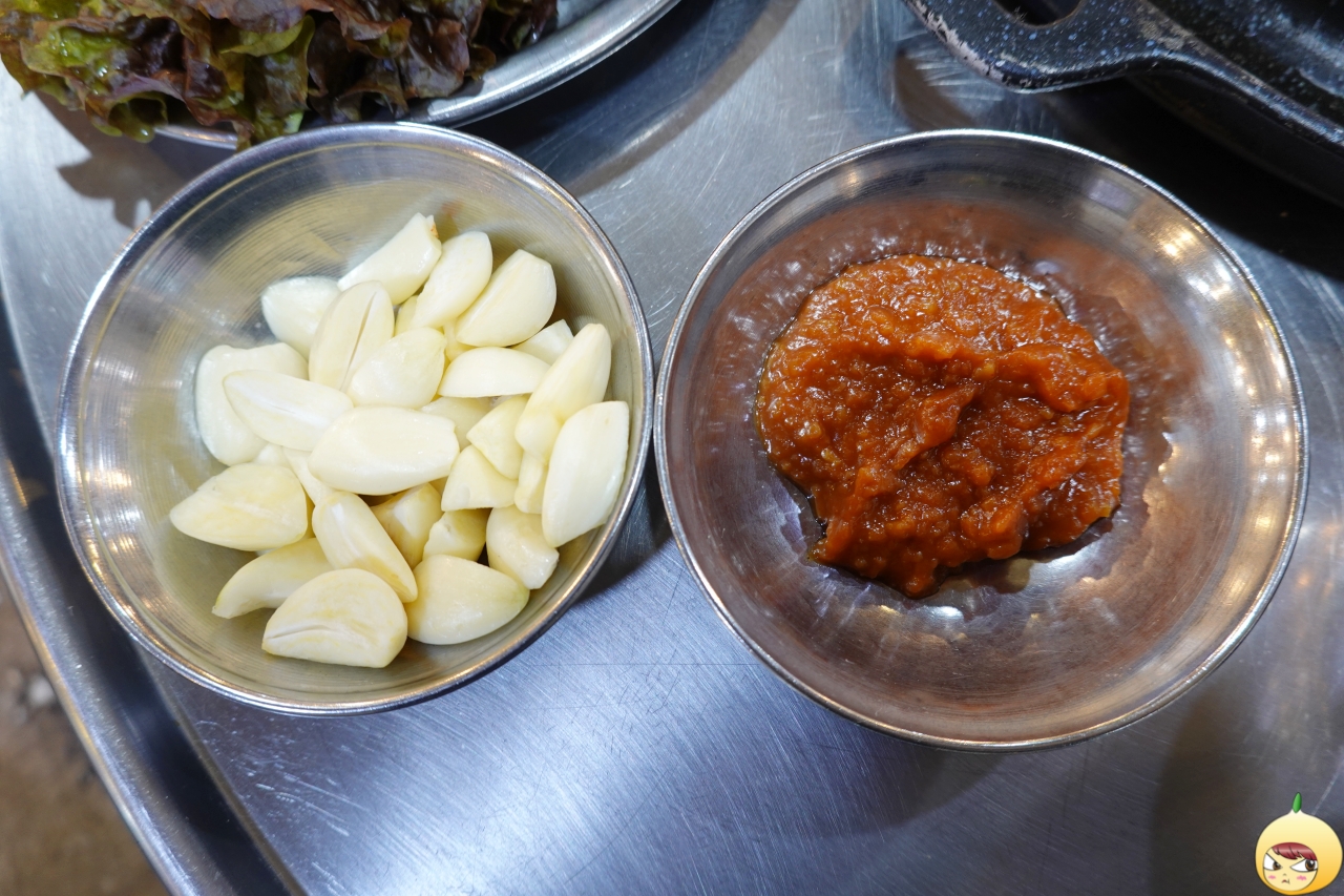 고기를 올리고, 참기름이 있는 공간에는 김치와 마늘을 넣으라고 직원이 알려줬다. 잘게 썰은 김치가 나온 이유는 이거였다. 여럿이 먹는다면 불판 가득 고기를 올려야 하지만, 혼자 먹으니 먹을만큼만 올린다. 대신 고기가 중간에 끊어지면 안되므로 시간차를 두고 올린다.