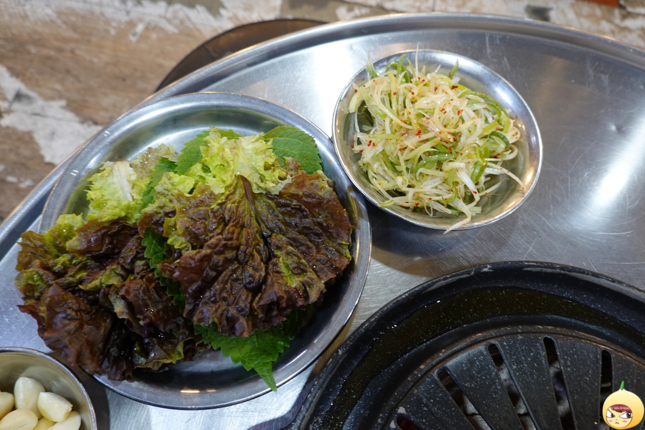 불판에서 고소한 향이 나서 자세히 보니 참기름이다. 갈매기살이 처음도 아니고, 불판 모양을 보니 계란물을 넣어주는구나 했다. 그런데 덩그러니 불판만 있다. 쌈채소와 파채무침 그리고 마늘과 쌈장은 고깃집 필수 반찬인데, 잘게 썬 배추김치는 살짝 튄다.