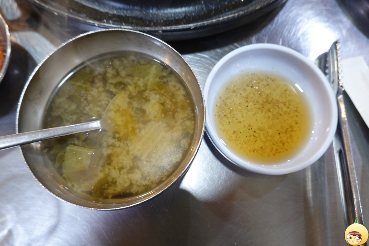 고기 먹을때 김치가 있으면 좋긴 한데, 양도 그렇고 담음새가 거시기(?)하기 때문이다. 김치의 역할을 잠시 후에 자동적으로 밝혀지고, 뜨끈한 우거지 된장국으로 먼저 속을 달래본다. 참, 쌈장이 있긴 하지만 갈매기살에는 기름장이 훨씬 잘 어울린다.