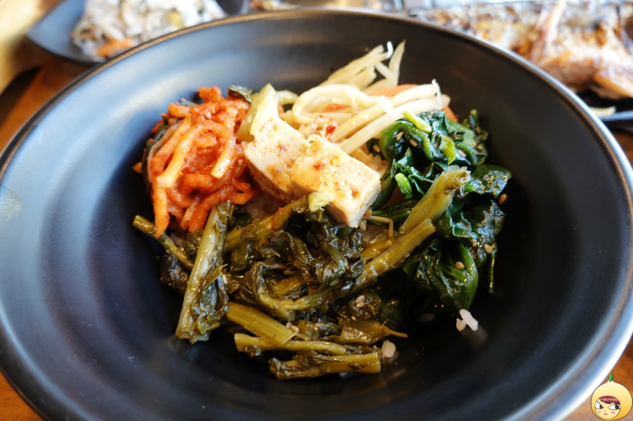 테이블에 밥공기가 아니라 대접이 있고, 반찬으로 4색 나물이 나왔다. 솥밥에 고등어구이를 올려서 계속 먹고 싶지만, 커다란 그릇 더하기 나물은 비빔밥이다. 테이블에 고추장까지 준비되어 있으니 비벼야 한다. 밥에 나물을 올렸으니 자연스럽게 고추장을 추가하면 된다.