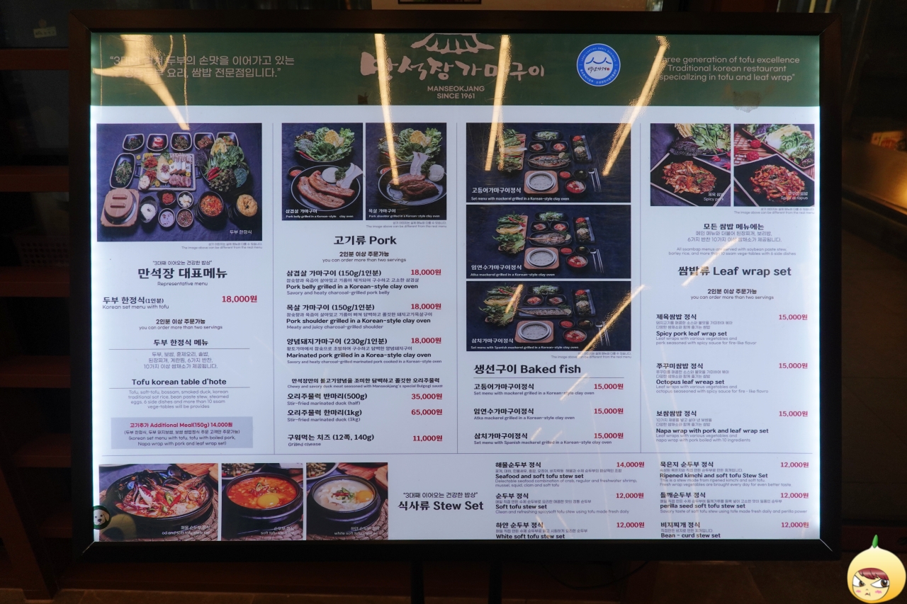 메뉴판이 밖에 있으니, 미리 확인할 수 있어 좋다. 두부를 직접 만든다고 하는데 두부정식은 2인부터다. 쌈채소에는 제육볶음인데 역시나 2인분을 주문해야 한다. 혼밥이어도 2인분을 충분히 먹을 수 좋을텐데, 위대하지 못해 1인을 먹어야 한다.