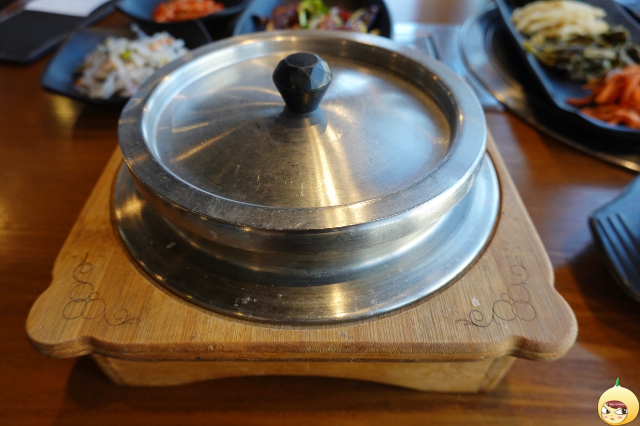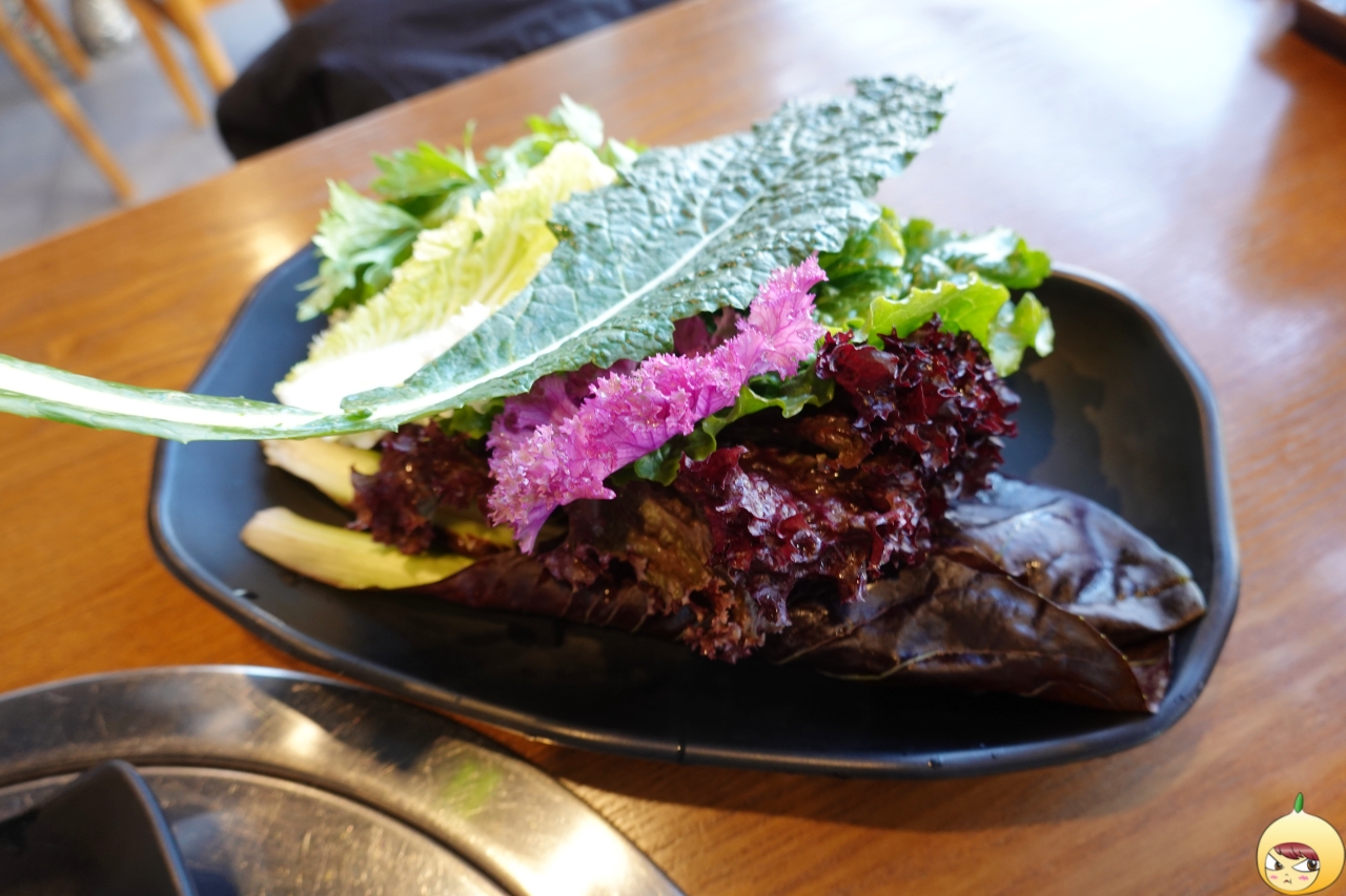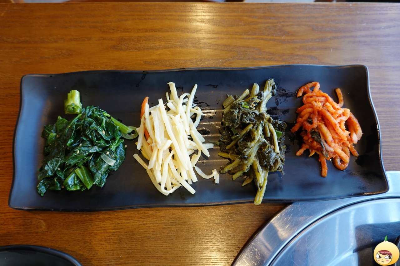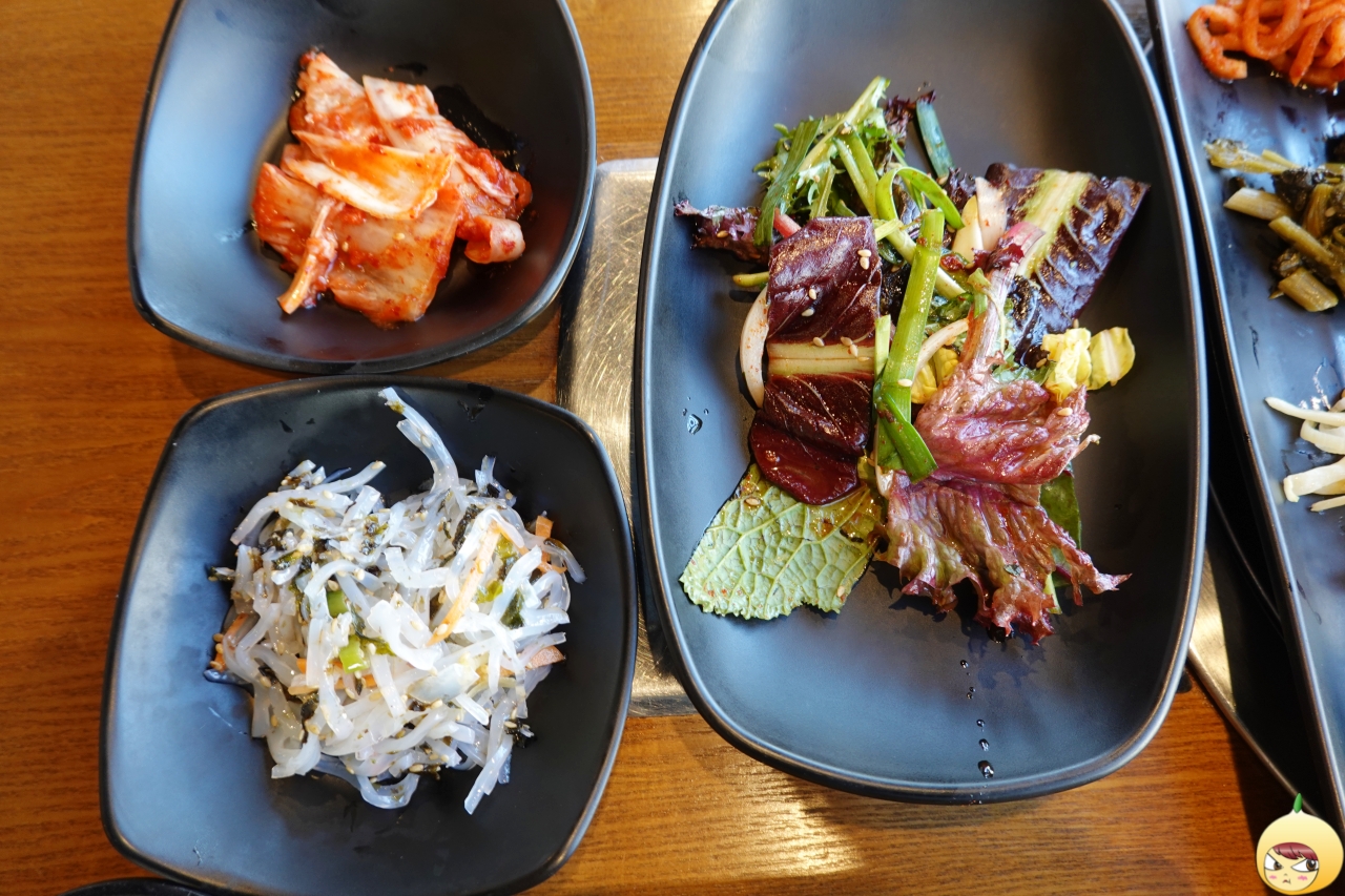 겉절이와 샐러드의 중간 정도 되는 샐절이(?)와 묵무침 그리고 김치가 나온다. 그리고 다른 접시에는 4가지 나물이 있는데, 오른쪽부터 무생채, 시레기, 죽순(인듯) 그리고 시금치처럼 생겼는데 시금치는 아닌 나물이 나왔다. 반찬은 전체적으로 간이 슴슴한 편이다.
