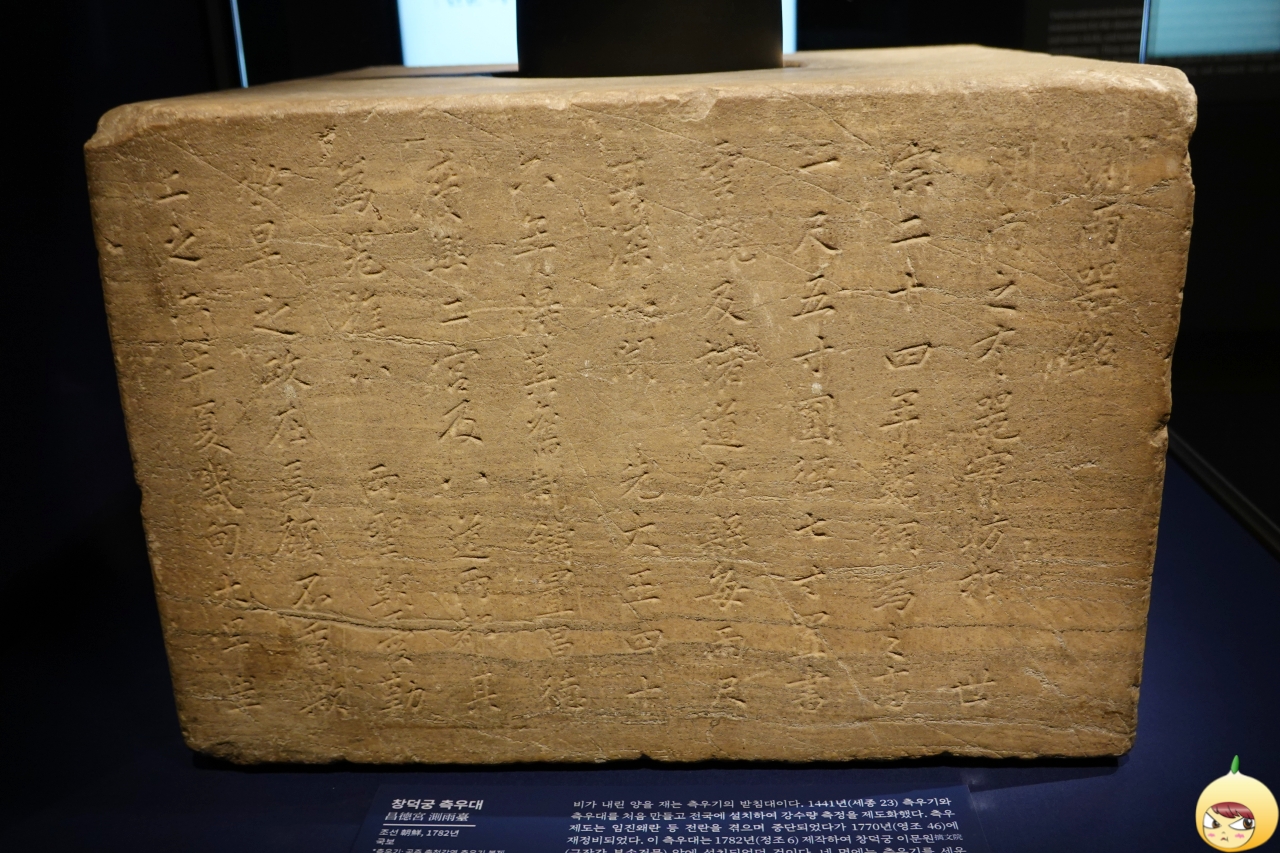 측우대에 새긴 글의 의미는 다음과 같다. "빗물의 양을 측정하는 전통은 세종 24년 제작한 높이 1척 5촌, 지름 7촌의 구리 측우기로 거슬러 올라간다. 서운관과 각도의 군·현에서는 비가 올 때마다 빗물의 양을 측정하고 보고했다. 영조 46년 옛 제도에 따라 측우기를 만들어 창덕궁, 경희궁 두 궁궐과 팔도, 양도(강화와 개성)에 설치했다. 그릇은 비록 작으나 두 성군께서 홍수와 가뭄을 다스리고자 힘쓴 뜻이 담겨 있으니 어찌 소중치 아니합니까.··· 이 측우기는 임금과 백성의 걱정과 기쁨이 연결되어 있으니 신들이 감히 공경히 지키고 부지런히 살피지 않겠습니까."