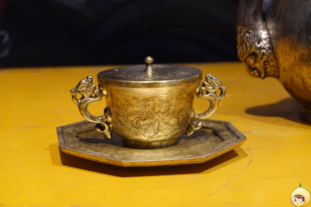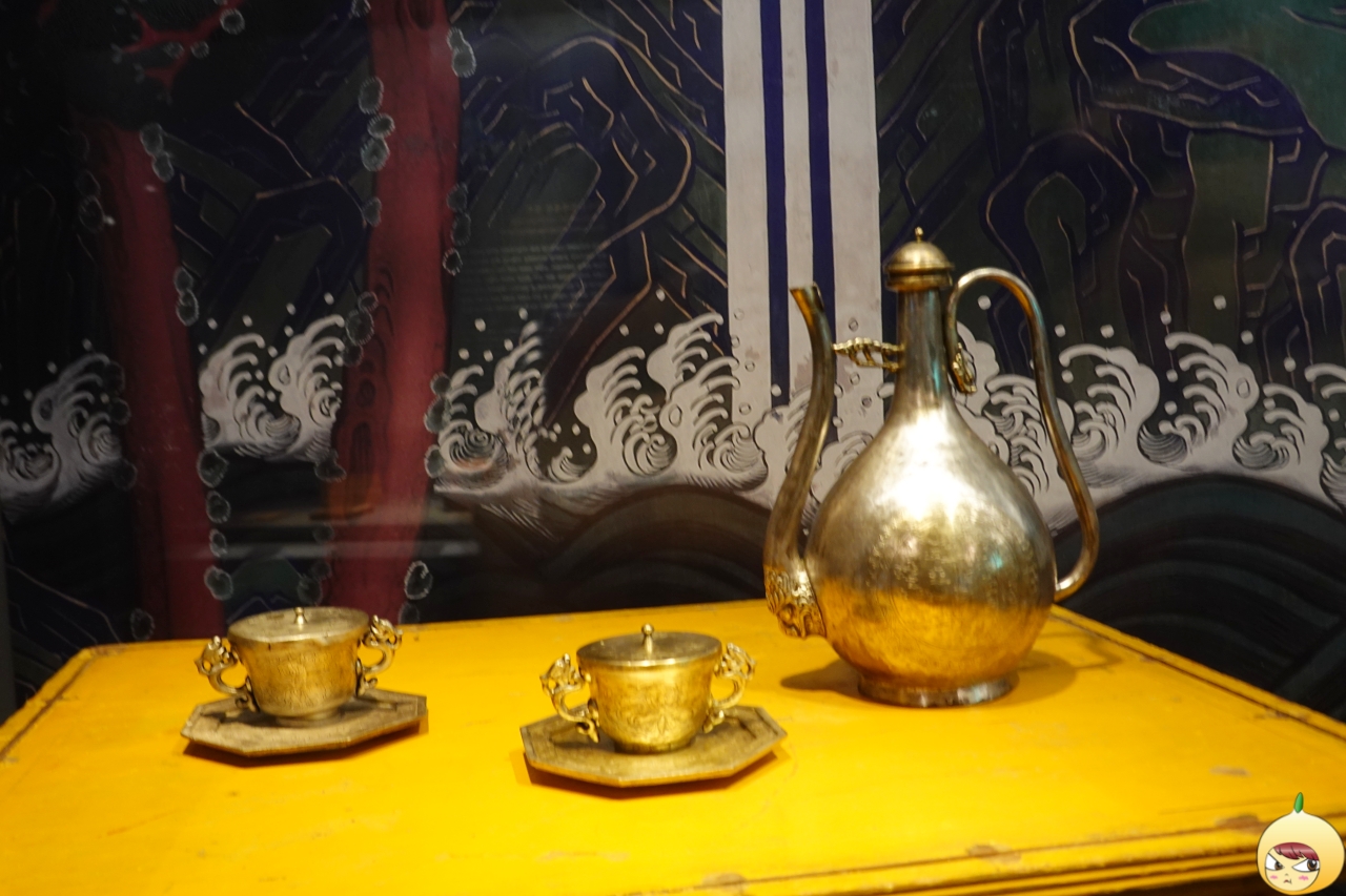 잔은 양쪽에 영지버섯 모양 손잡이가 있고, 팔각형 잔받침에는 8마리의 박쥐가 새겨져 있다. 줌으로 열심히 당겼지만, 박쥐 모양은 확인하지 못했다.