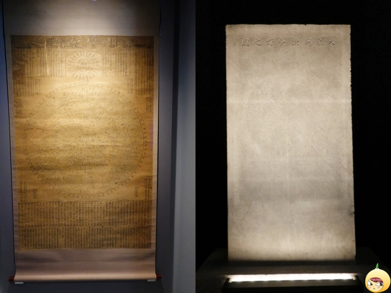 천상열차분야지도 목판본(1571년)과 복각천상열차분야지도 각석(1687년)이다. 목판본은 선조4년에 제작한 것으로 은하수를 제외한 천문도 바탕은 옅은 푸른색으로 채색했고, 적도와 28수 별자리 그리고 일부 별자리는 붉은색으로 표시했다.
