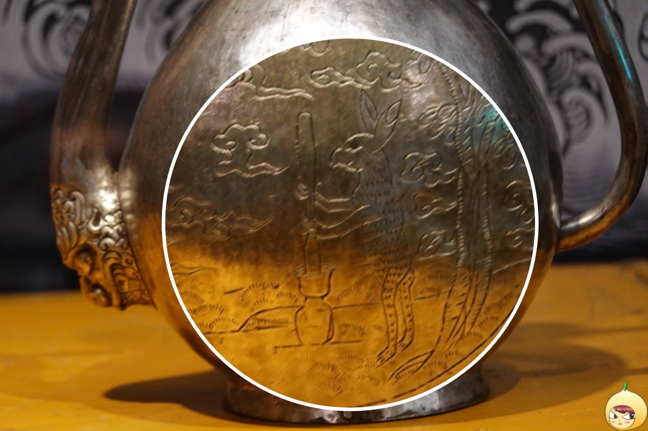 은도금일월병은 왕실의 연향에 사용된 은제주전자이다. 중앙의 문양이 있는 부분과 꼭지 등 일부분은 금도금으로 되어 있다. 중심이 되는 문양은 태양을 상징하는 세발까마귀(뒷면에 있는듯)와 달을 상징하는 방아 찧는 토끼다. 토끼는 예로부터 다산과 지혜의 상징처럼 여겨지는 동물이기도 하지만, 무엇보다 서왕모(중국 도교 신화에 나오는 불사의 여왕)와 얽힌 고대 설화에 등장하며 불사약을 만들기 위해 방아를 찧는 모습으로 묘사된다.