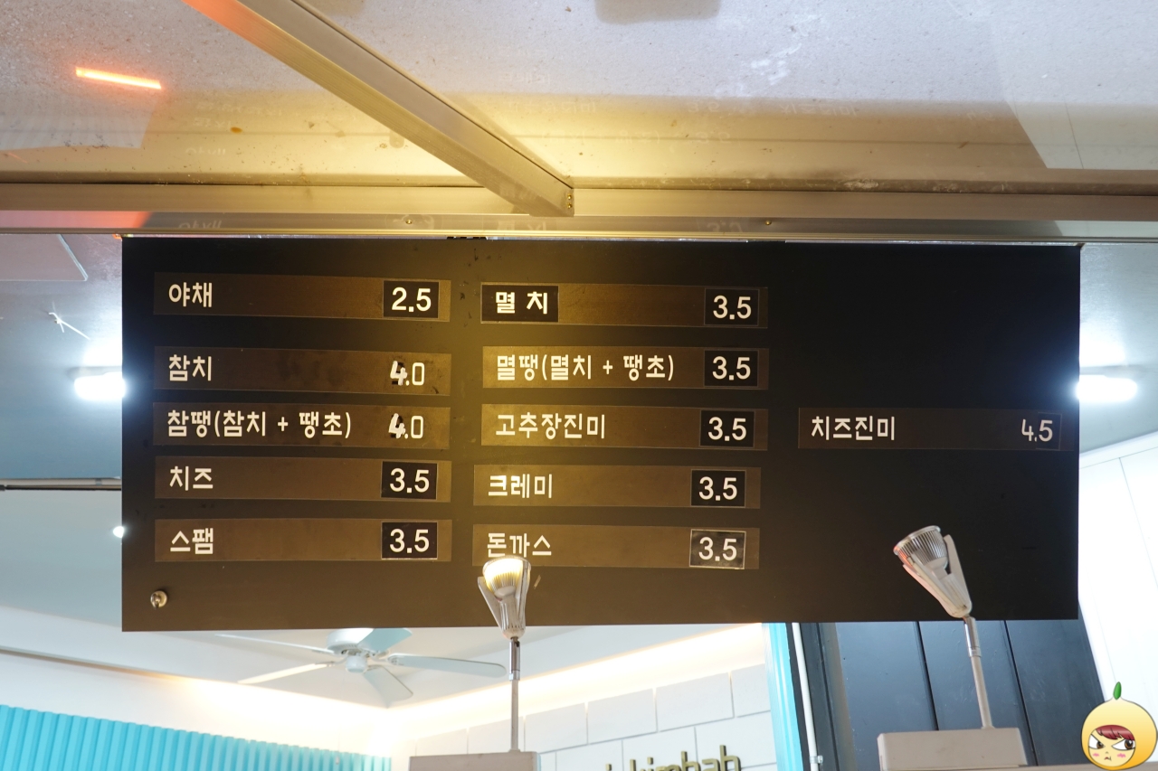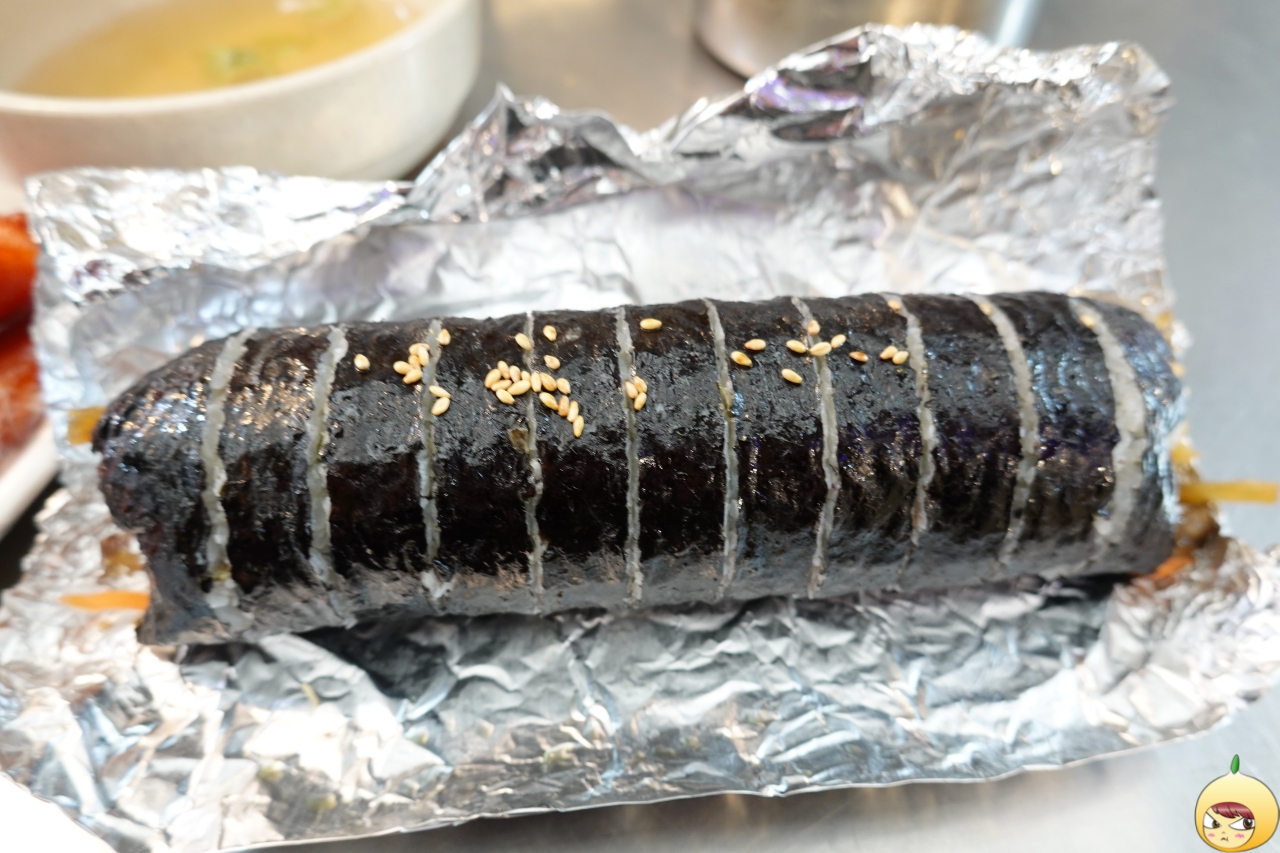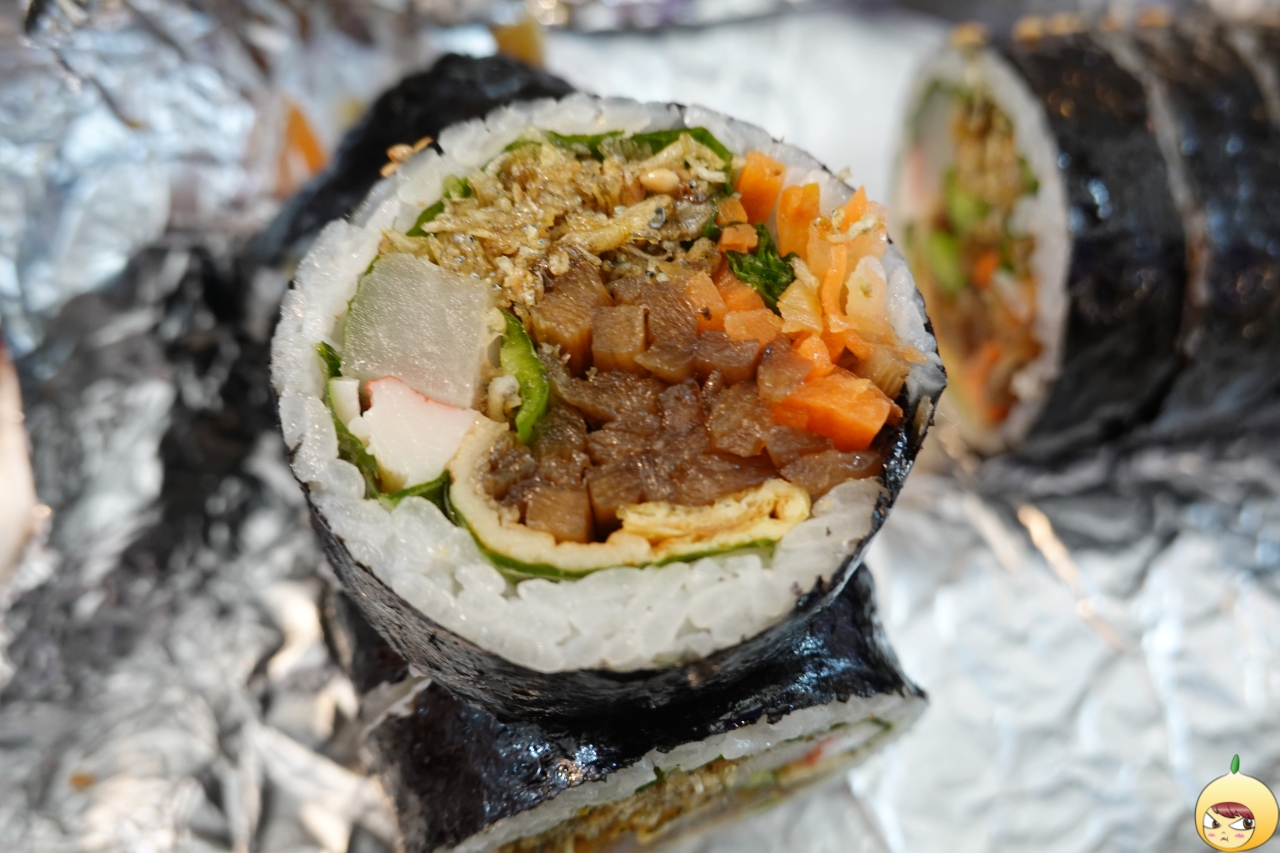 꼬마김밥 수준을 넘어 일반 김밥전문점에서 파는 김밥보다 더 크다. 요즘 트렌드에 맞게 밥은 조금, 속재료는 가득이다. 멸땡김밥이니 멸치볶음이 있고, 중앙은 우엉이 차지하고 있다. 그 옆으로 작게 보이는 녹색이 청양고추고, 그 옆으로 단무지와 맛살이 있다. 그리고 어묵과 당근도 있다.