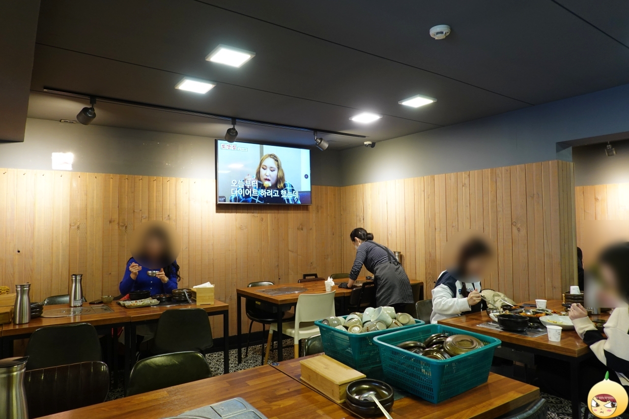 또간집 영상이 나오는 모니터 아래 테이블에 앉았다. 1시가 넘었는데도 여전히 사람이 많다. 오른쪽 사진은 사람들이 빠지고 다시 채워지기 전에 후다닥 담았다.