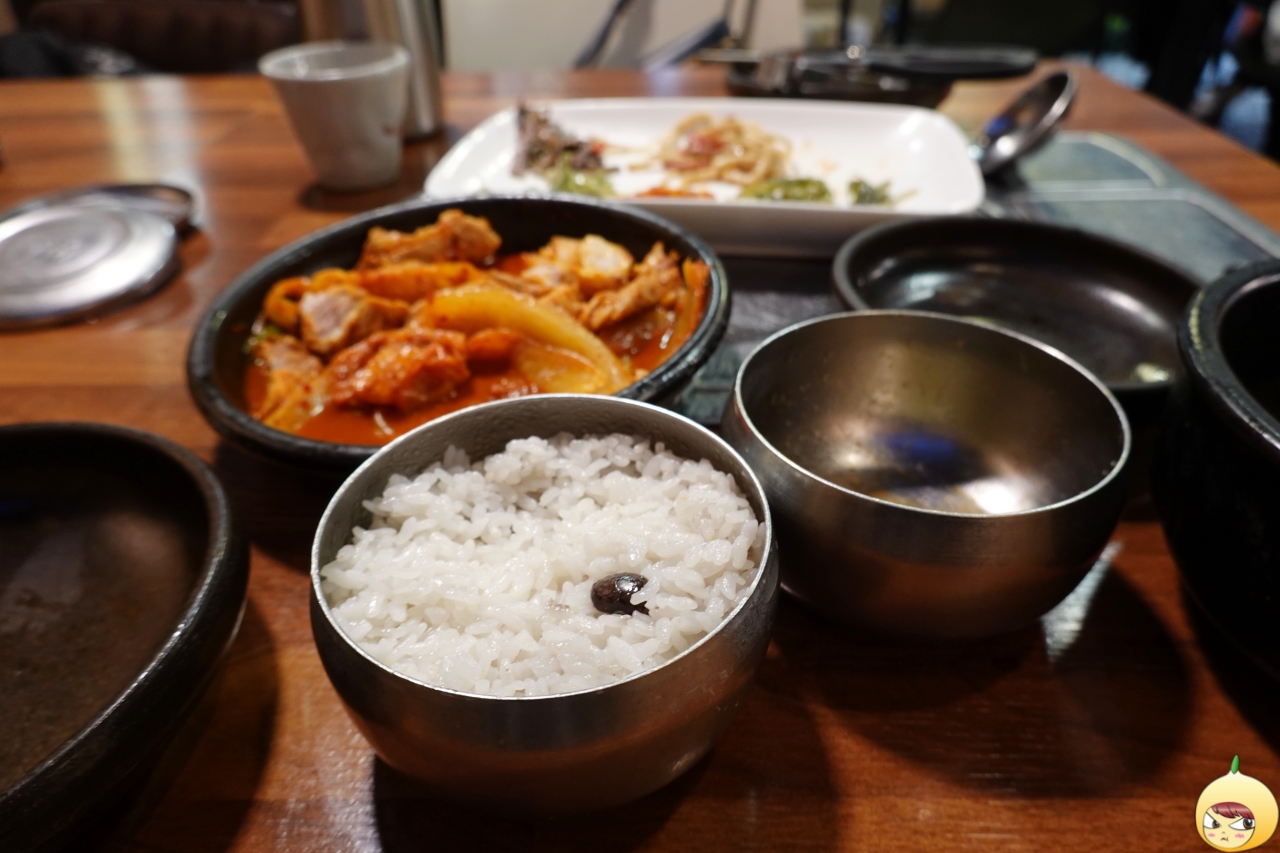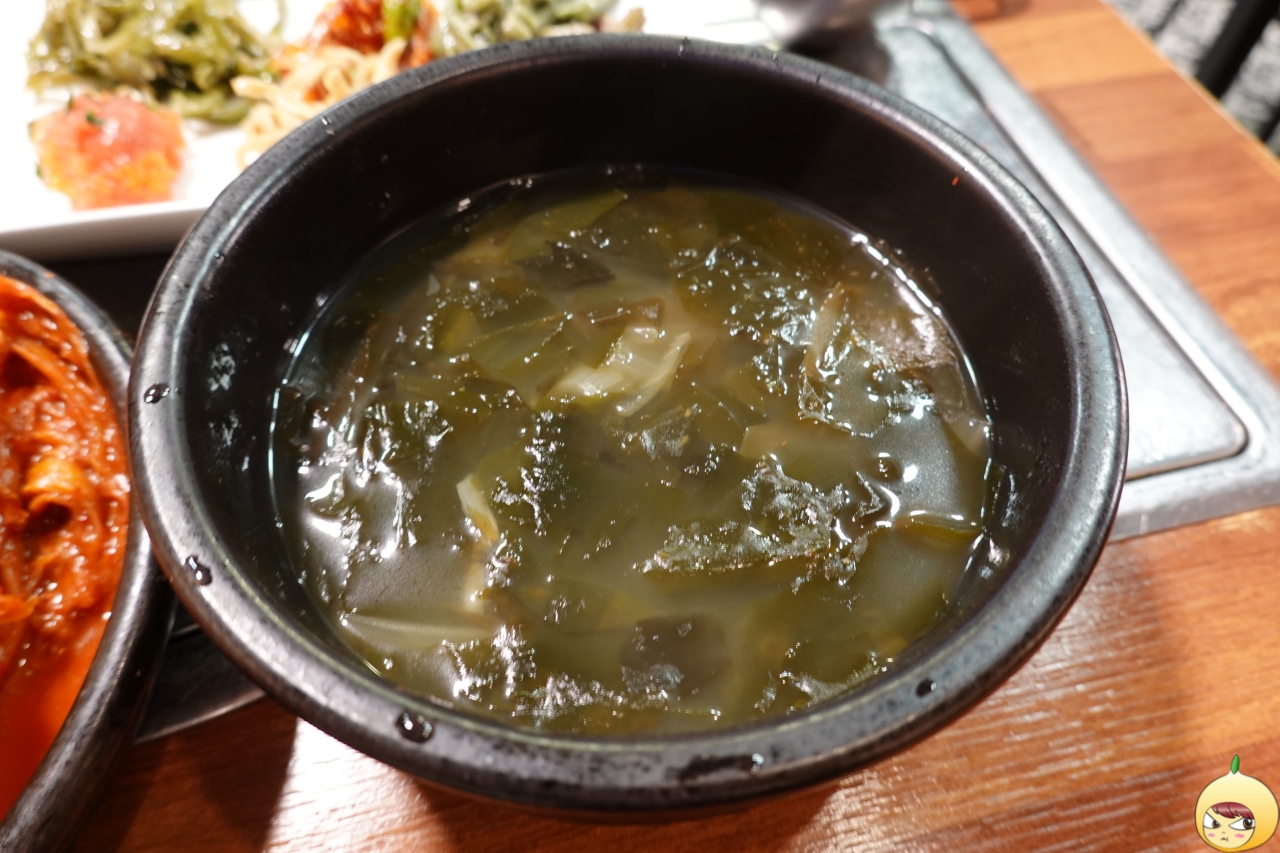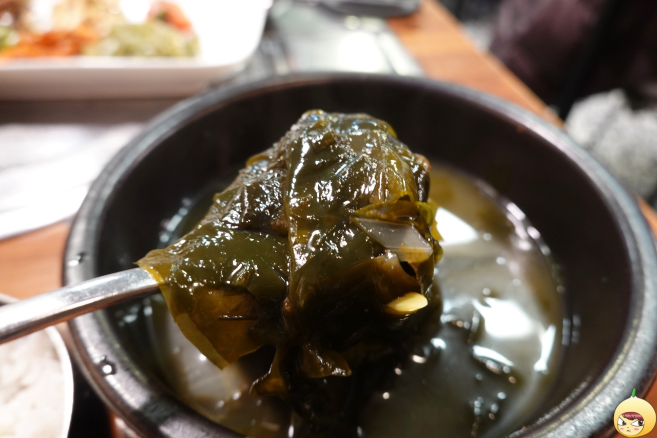 2인분을 주문했지만, 혼밥이라서 6가지 반찬은 각각이 아니라 한 접시로 나왔다. 왼쪽부터 아삭한 식감이 좋은 상추대나물 무침과 진미채인 줄 알았는데 황태채볶음이고, 마지막은 미역줄거리볶음이다. 미역국에 이어 반찬만으로도 밥 한공기를 쉽게 아작낼 수 있지만, 참아야 한다.