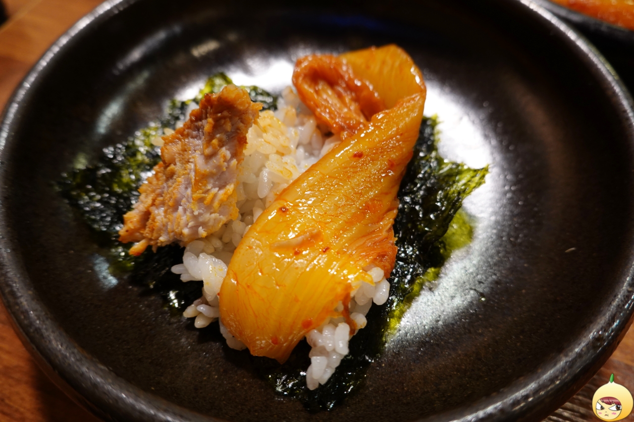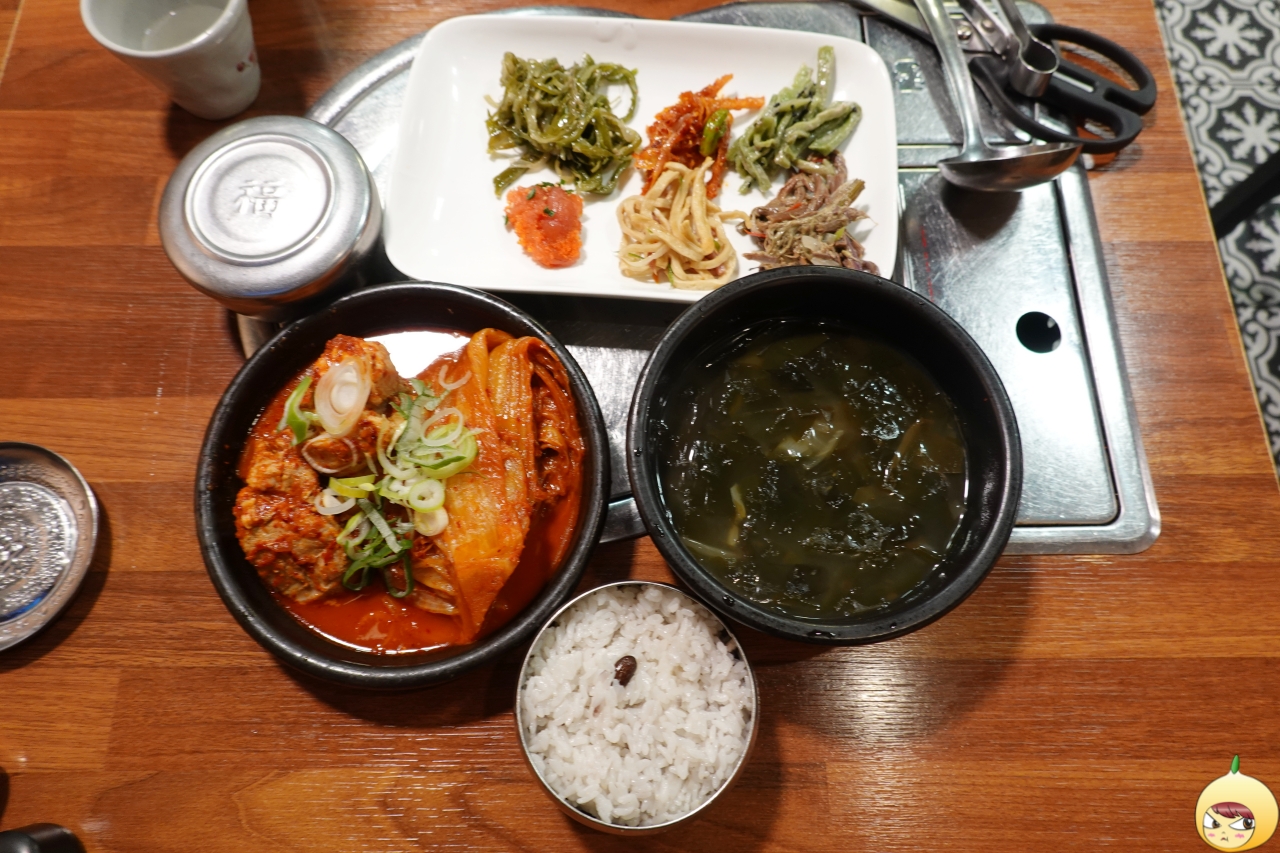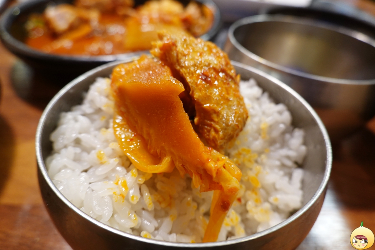 2인분을 주문했지만, 혼밥이라서 6가지 반찬은 각각이 아니라 한 접시로 나왔다. 왼쪽부터 아삭한 식감이 좋은 상추대나물 무침과 진미채인 줄 알았는데 황태채볶음이고, 마지막은 미역줄거리볶음이다. 미역국에 이어 반찬만으로도 밥 한공기를 쉽게 아작낼 수 있지만, 참아야 한다.