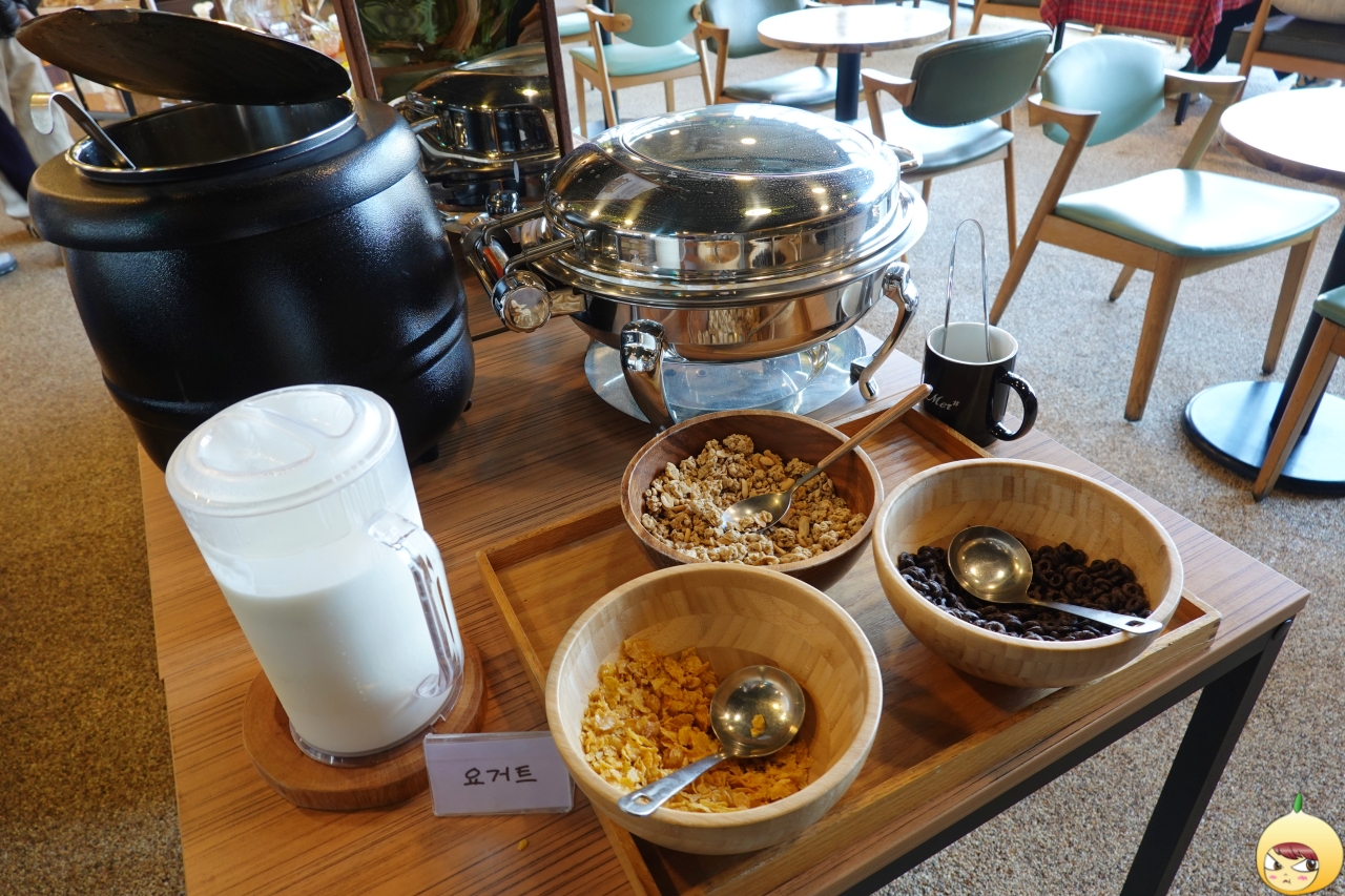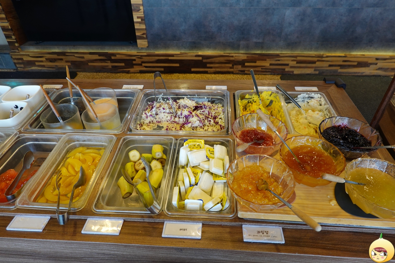 감자, 단호박, 양배추 샐러드를 시작으로 과일과 버터 그리고 5가지 과일잼이 있다. 그 옆에는 요거트와 수프가 있고, 토스트기와 함께 빵이 준비되어 있다. 이게 뭐지 하고 직원에게 물어보니, 9시 30분부터 12시 30분까지 하는 라메르 세트라고 한다.