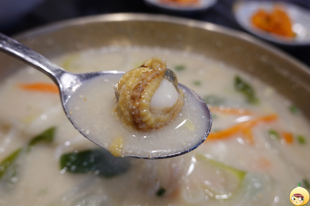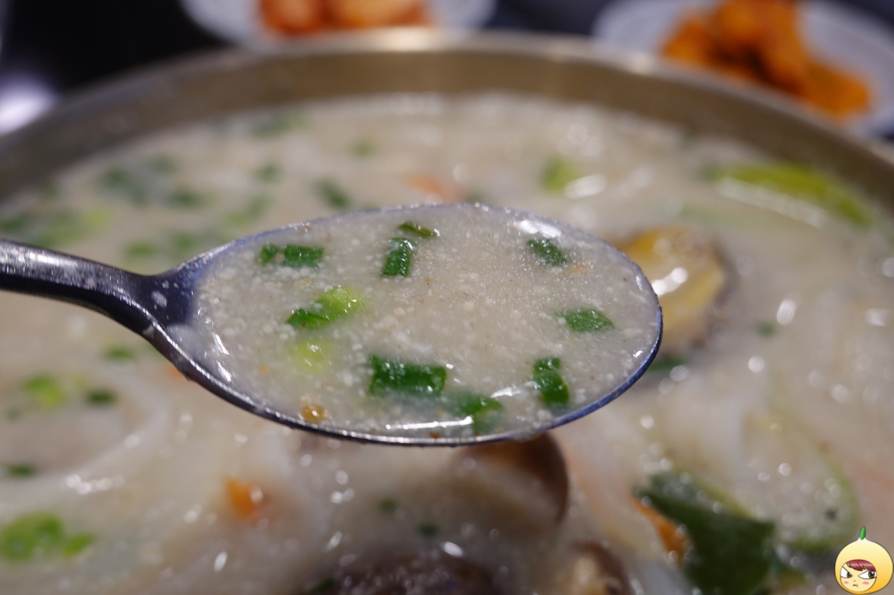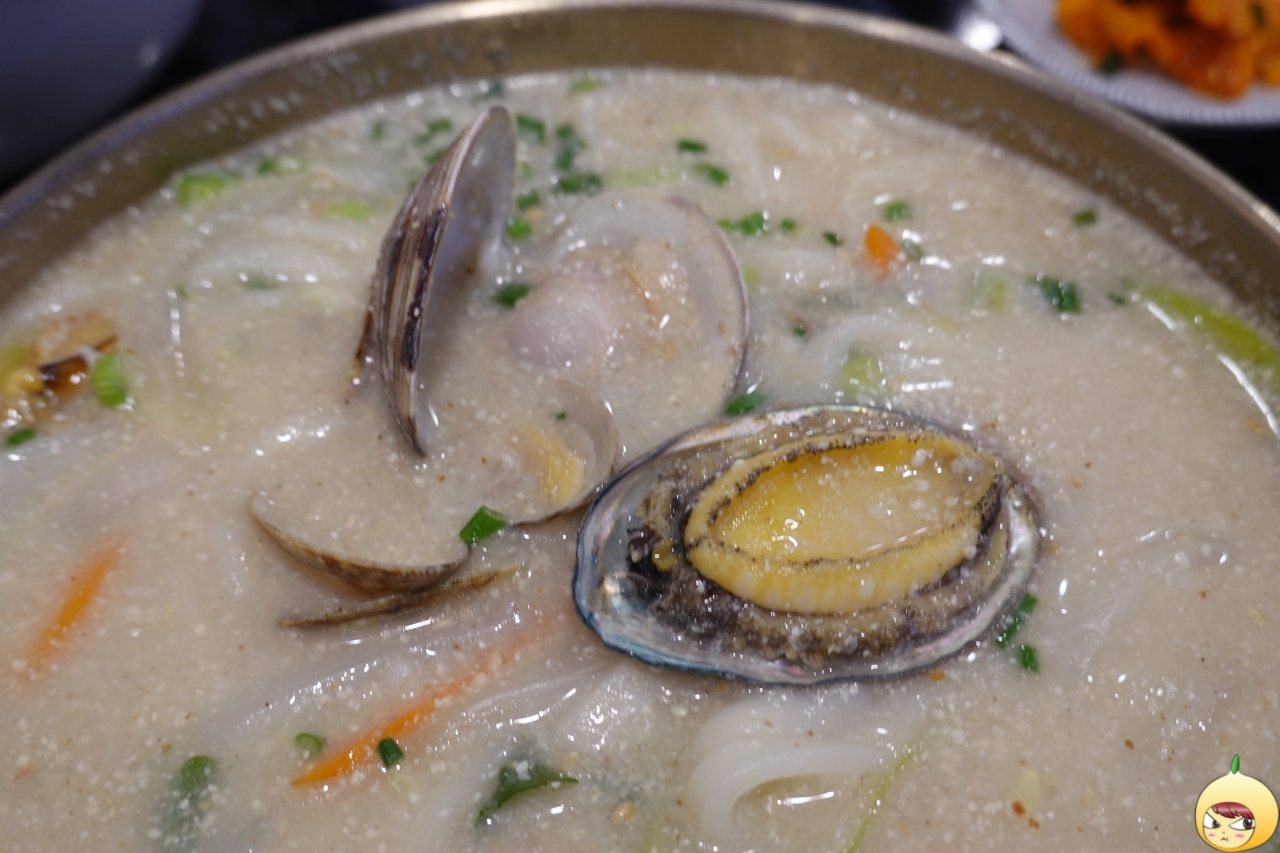 배너광고에 나와있는 칼국수 그림 옆으로 '들깨를 넣어 고소한 국물이 일품'이라고, 이걸 지금 봤다. 전복에 바지락이 들어있는 해물칼국수이니 당연히 맑은 국물일 줄 알았다. 하지만 보이는 대로 들깨가 들어있는 걸쭉한 칼국수다.