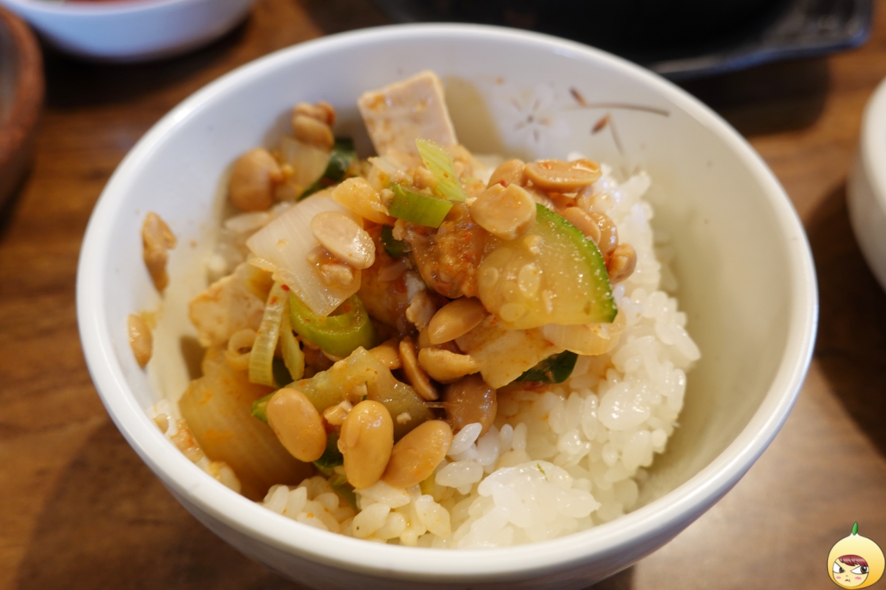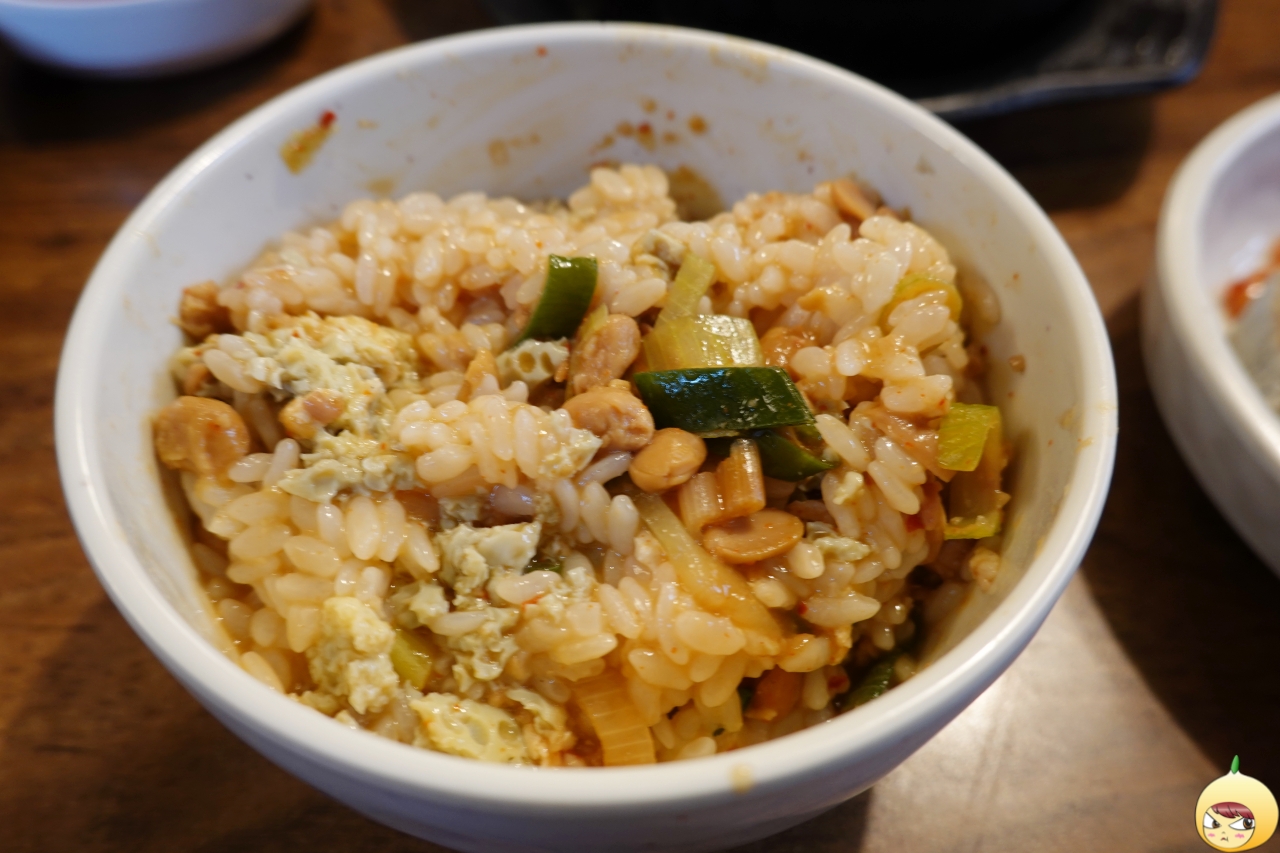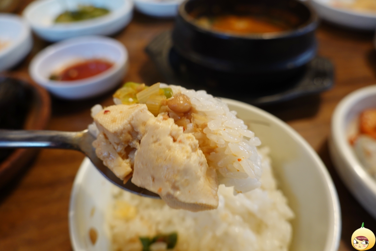 자고로 청국장은 비빔이다. 국물보다는 건더기 위주로 밥그릇에 넣어서 쓱쓱 비빈다. 이때, 아껴놓은 계란찜을 추가해, 식물성과 동물성 단백질을 만나게 한다. 청국장비빔밥만 먹어도 되지만, 두부구이에 나온 볶음김치를 올려서 먹어도 좋다.