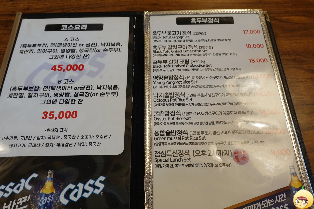 흑두부를 직접 만드는지, 관련 메뉴가 많다. 코스는 혼밥이라 무리고, 무슨무슨 정식은 점심치고는 사악한 가격이다. 그런데 가장 아래에 있는 점심특선정식(9,000원)은 가성비는 기본, 혼밥 메뉴로도 훌륭해 보인다. 순두부와 청국장 중 하나를 선택해야 하는데, 묻지도 따지지도 않고 당연히 청국장이다.