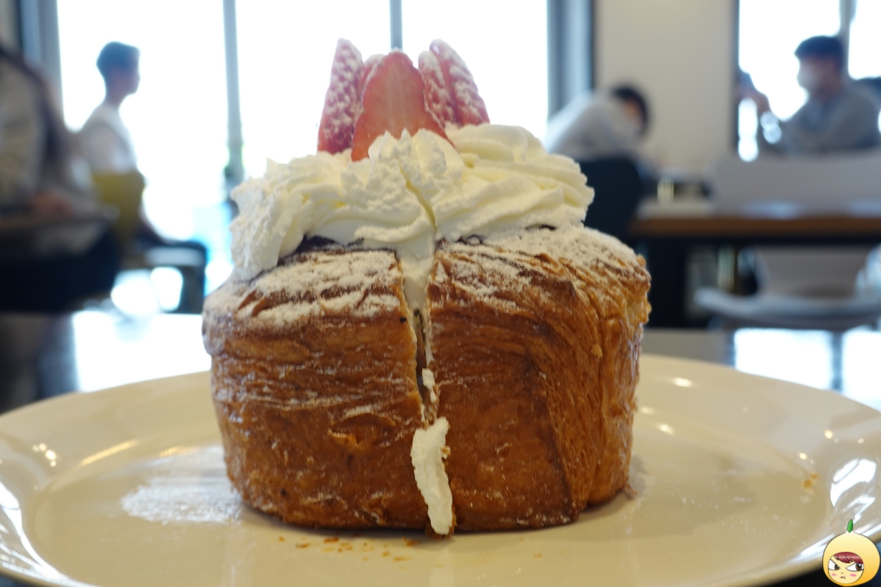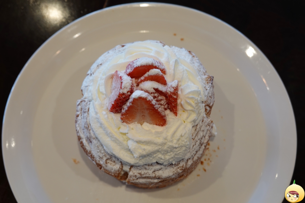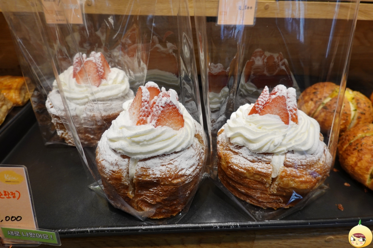 빙하가 덮고 있는 몽블랑은 프랑스어로 흰산이라고 한다. 흰산을 표현하기 위해 슈가파우더를 뿌리는 곳도 있던데, 여기는 슈가파우더에 생크림까지 더했다. 그리고 딸기는 시즌한정이다. 페스츄리답게 결이 하나하나 다 살아 있다.