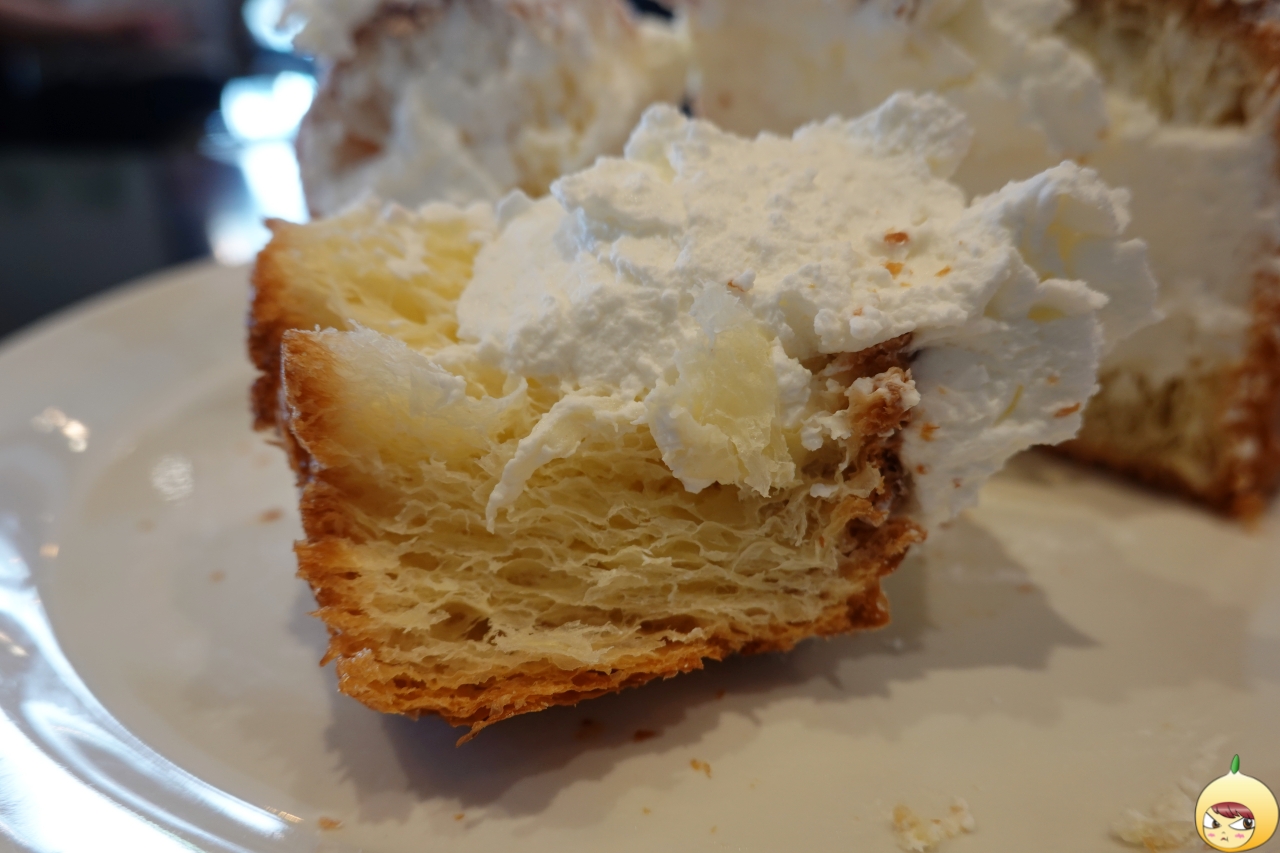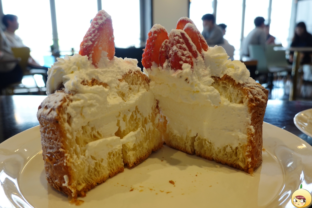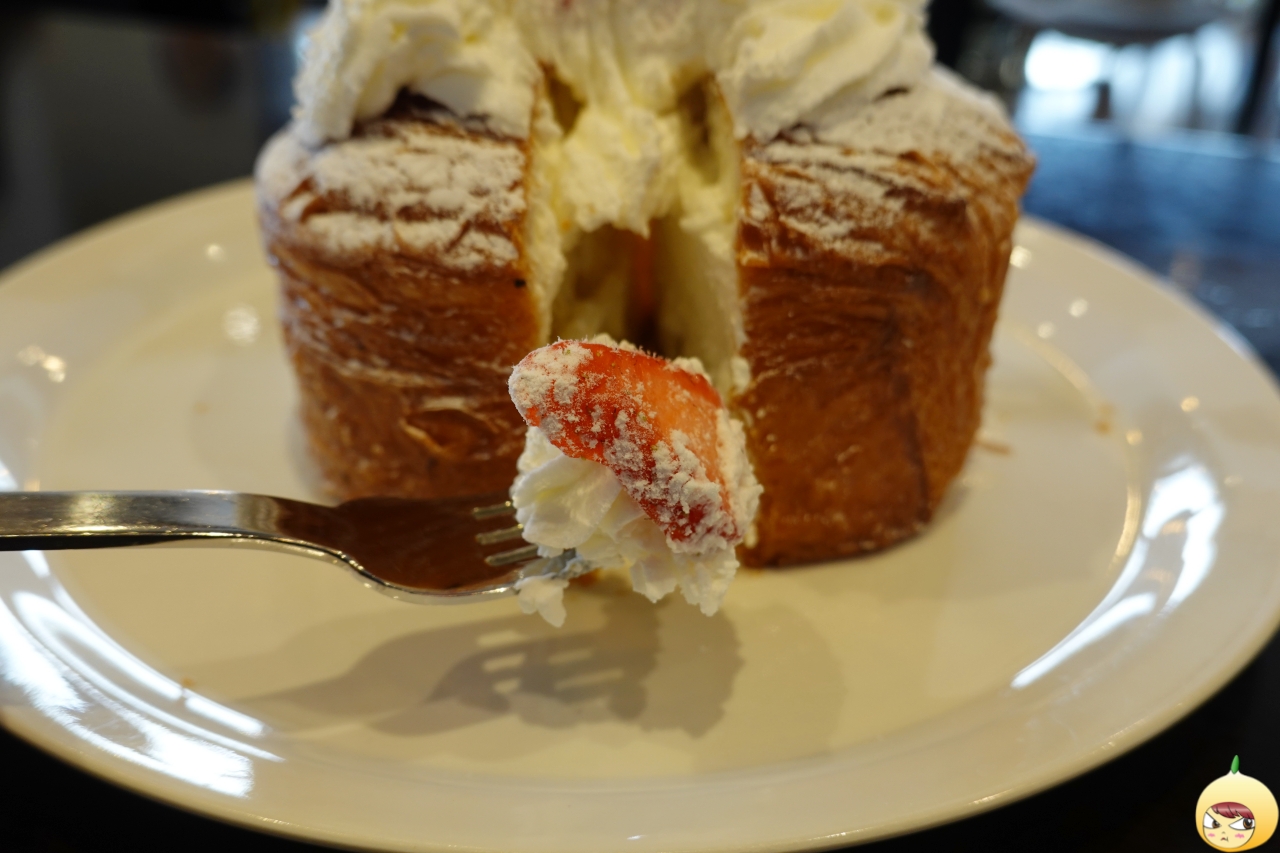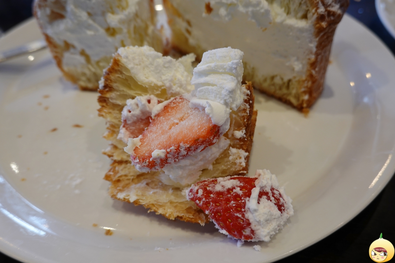 빙하가 덮고 있는 몽블랑은 프랑스어로 흰산이라고 한다. 흰산을 표현하기 위해 슈가파우더를 뿌리는 곳도 있던데, 여기는 슈가파우더에 생크림까지 더했다. 그리고 딸기는 시즌한정이다. 페스츄리답게 결이 하나하나 다 살아 있다.