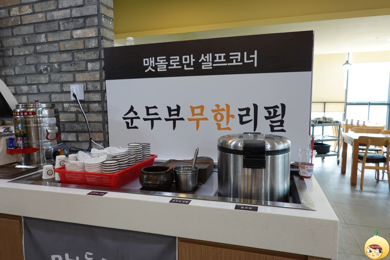 주문을 하자마자, 순두부 코너로 직행한다. 커다란 밥솥에 순두부가 조금 남아 있었는데, 직원이 잠시만요 하면서 새 순두부로 다시 세팅을 했다. 굳이 이럴 필요까지 없다고 말은 했지만, 속으로는 쾌재를 불렀다. 아무도 걷지 않은 눈길을 걷는 기분이랄까?
