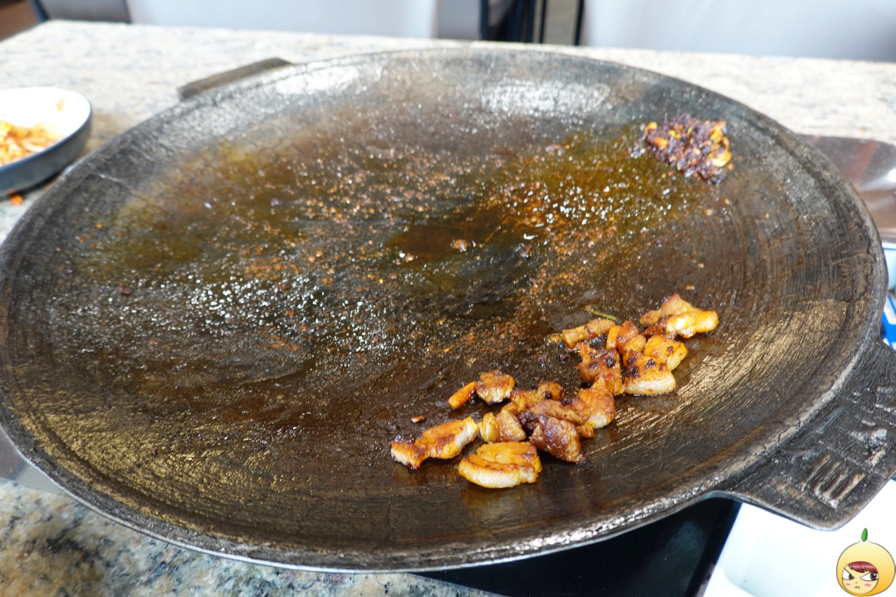돼지기름에 김치를 굽다 말고, 고기를 올린다. 이유는 간단하다. 비계를 바삭한 과자처럼 만들기 위해서는 튀기듯 구워야 한다. 요즈음 돼지고기도 80%정도 익히고 먹는다고 하던데, 비계를 못먹는 1인은 언감생심이다.