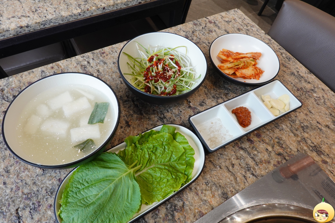 반찬은 구이용과 안구이용으로 나뉜다. 구이용에는 콩나물무침과 김치, 미나리이고, 안구이용은 파채무침, 동치미, 배추김치 그리고 쌈장, 마늘, 양념장이다. 구이용 반찬을 세팅하면서, 이따 고기가 나오면 같이 구우면 된다고 했다. 그런데 잠시 후, 다른 직원이 오더니 구이용 바반찬을 죄다 가져갔다. 어라~ 왜 그러지?