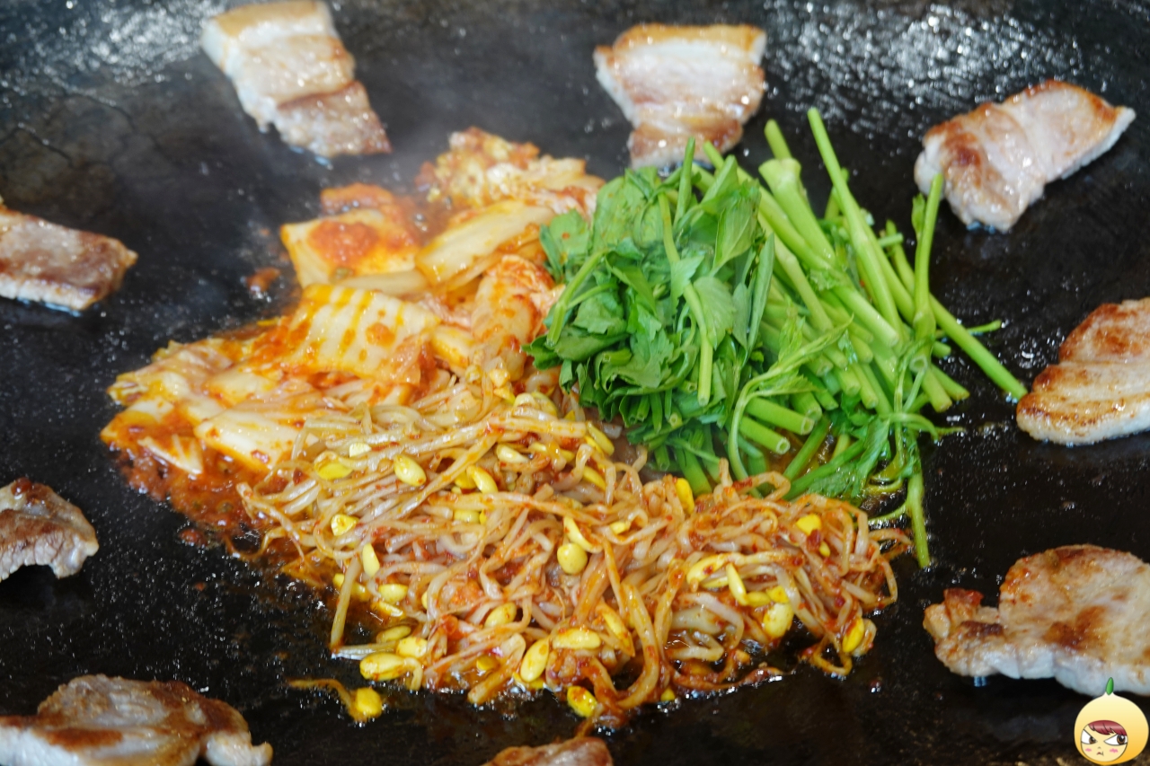 구이용 반찬 3가지 중에서 콩나물침은 그닥, 미나리는 쌈에 넣지 않고 단독으로, 김치는 안구이용 김치까지 더해서 다 구워 먹는다. 고기를 먹는 건지, 김치는 먹는 건지 모를 정도로 돼지기름에 구운 김치는 최강이다.
