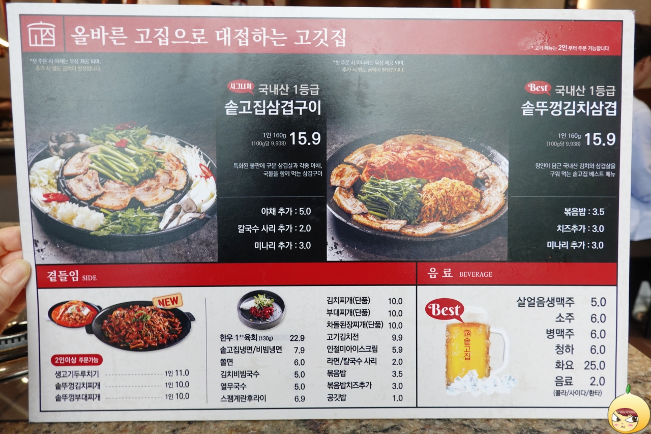 솥뚜껑 김치찌개가 먹고 싶어서 들어왔는데, 메뉴판을 보고 있으니 솥뚜껑김치삼겹(1인 15,900원)이 확 끌린다. 다시한번 조심스럽게 물어본다. "원래 1인분이 안되는 줄 알지만, 혹시나 가능할까요?" 3시간 같은 3초가 지난 후 직원은 이렇게 말했다. "원래는 안되지만, 바쁘지 않아서 해드릴게요."