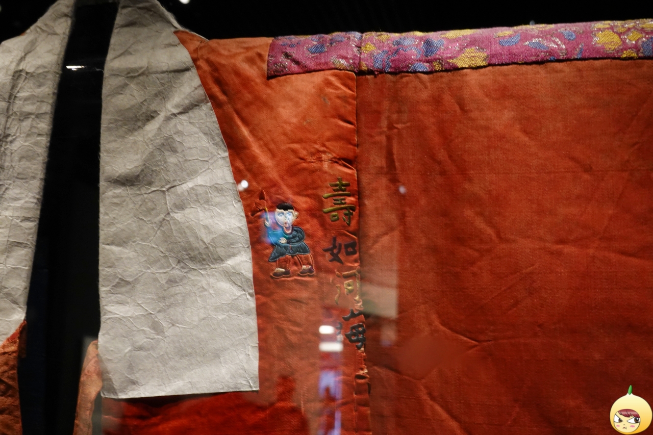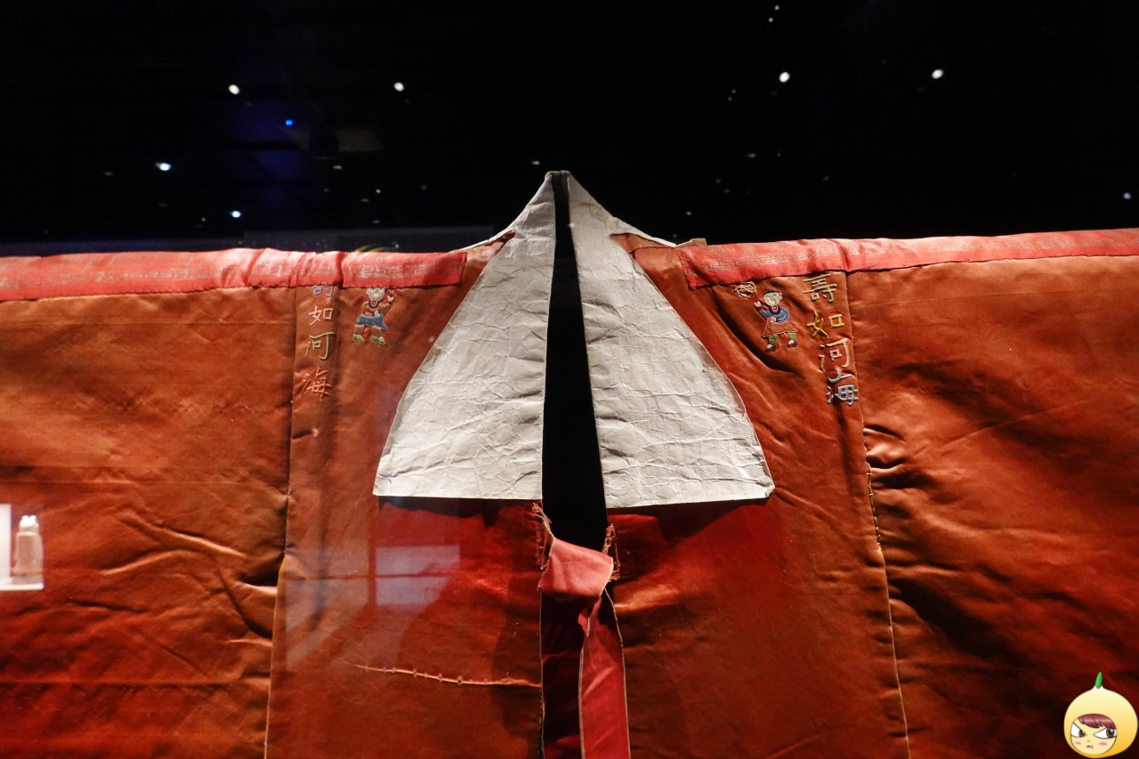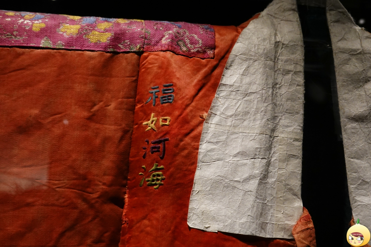 겉감은 홍색의 민무늬 비단, 안감은 청색의 복숭아·석류·불수감무늬 비단으로 되어 있다. 연꽃, 모란, 봉황, 백로, 나비 등 길상 무늬를 화려하게 수놓았고, 앞길 상단에는 동자무늬와 함께 수여하해 복여하해(바다와 강처럼 오래 살고 재물이 쌓이다)가, 뒷길에는 이성지합 만복지원(남녀의 결합은 곧 만복의 근원이다)이 수놓아져 있다.
