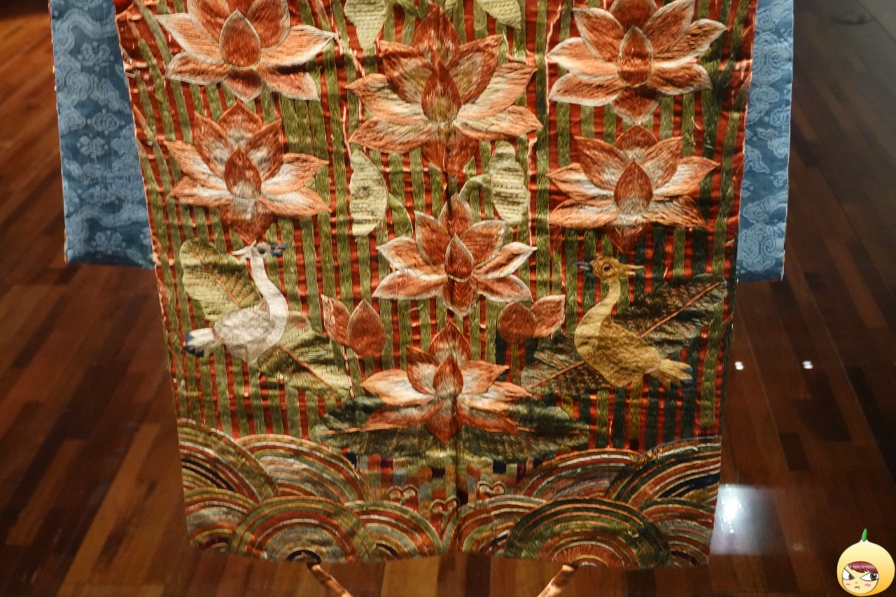 궁중 자수는 왕실 소속 화원이 자수의 밑그림인 수본을 제작하고 침선장과 침선비가 그 동안을 바탕으로 자수를 놓았다. 복온공주 홍장삼은 천연 염색의 자연스런 빛깔을 담은 색실, 화려하면서도 정제된 표현과 섬세하고 정교한 기술이 느껴지는 궁중 자수의 전형을 보여준다.