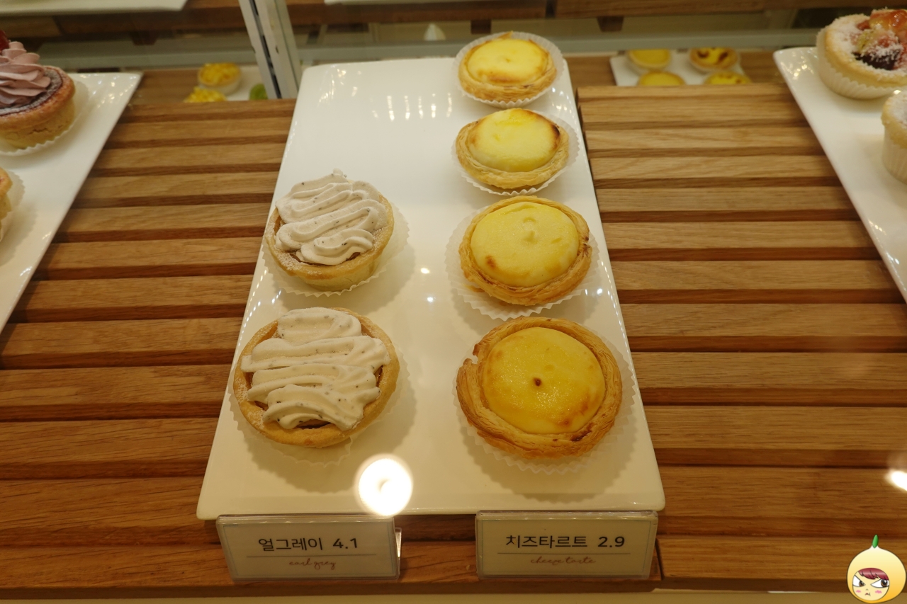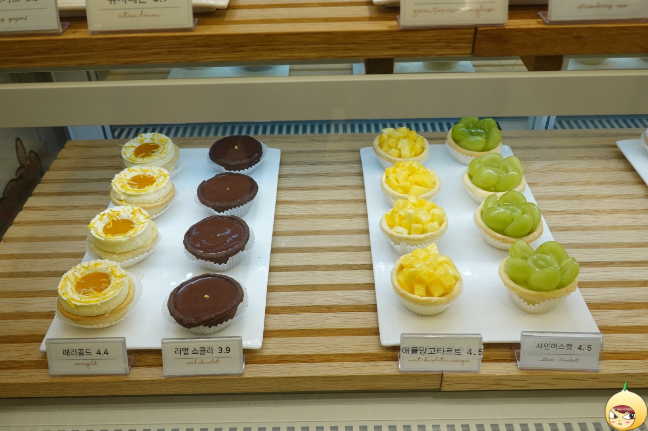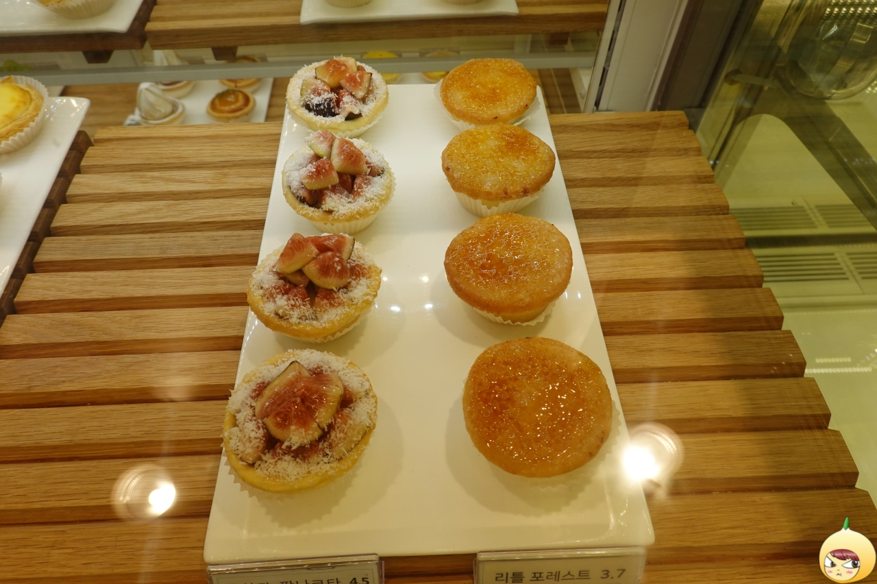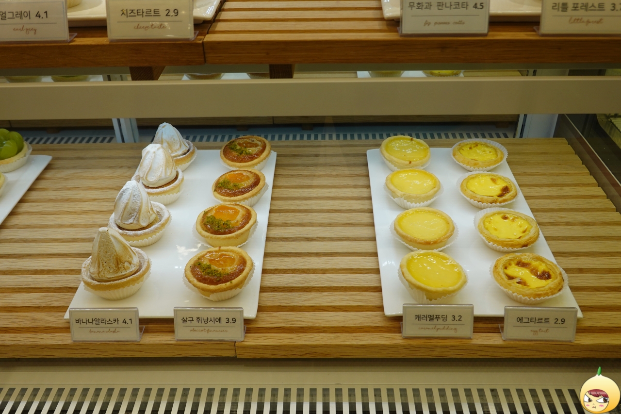 왼쪽부터, 바나나알라스카와 살구휘낭시에, 캐러멜푸딩과 에그타르트 그리고 메리골드와 리얼쇼콜라, 애플망고타르트와 샤인머스켓이다. 타르트가 처음은 아닌데, 종류가 이렇게나 많은 곳은 처음인 듯 싶다. 그런데 아직 끝나지 않았다.