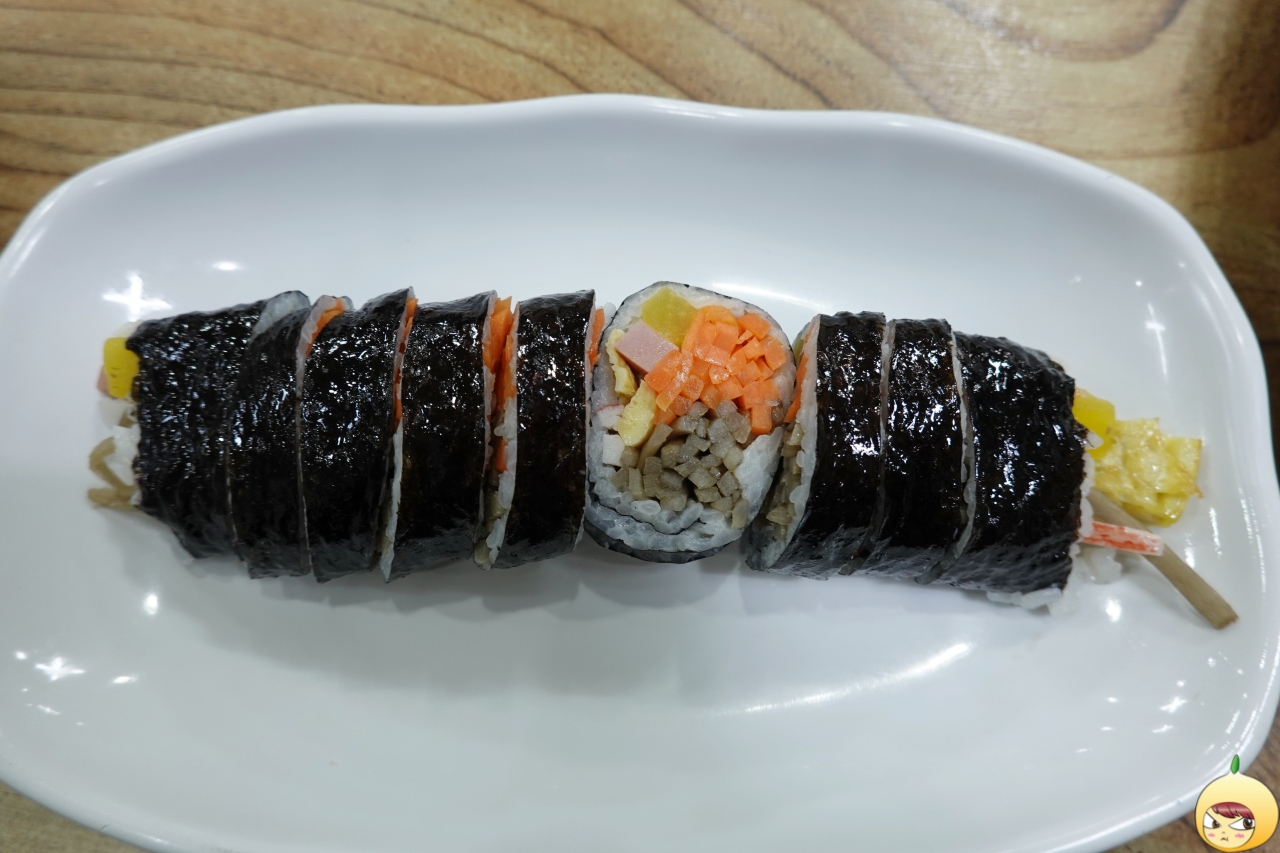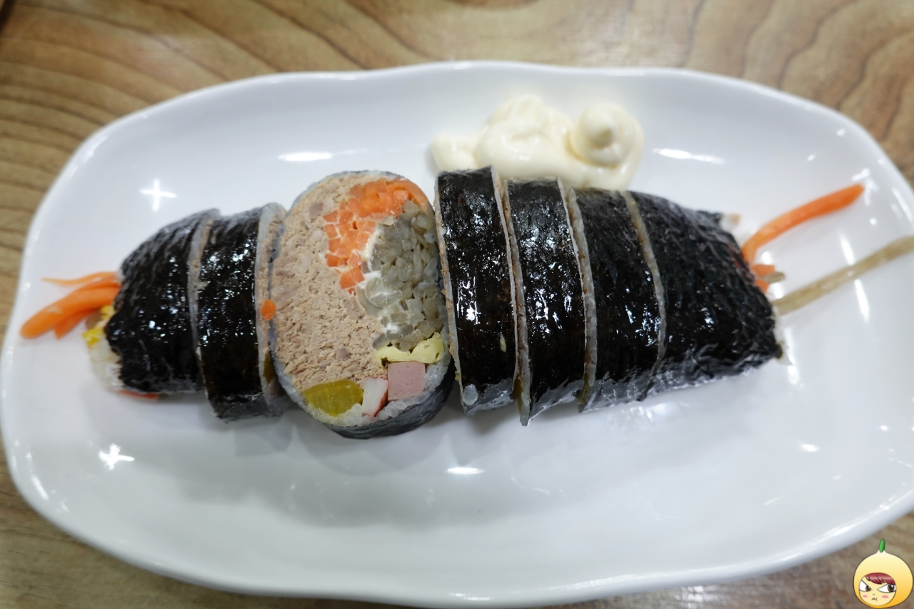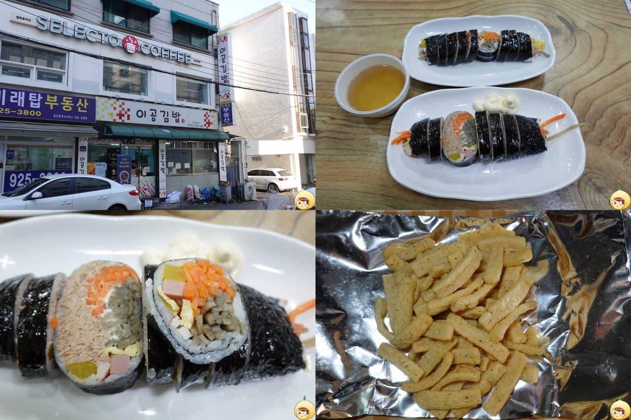 보통 사이즈의 이공김밥은 참치를 뺀 다른 속재료가 들어있다. 우엉과 당근이 많은 지분을 차지하고 있다 보니, 아삭한 식감은 자칫 평범해 보이는 김밥의 맛을 살렸다. 목넘김 후 찾아오는 우엉의 풍미는 김밥을 계속 먹게 만든다.