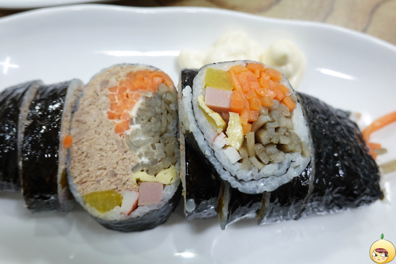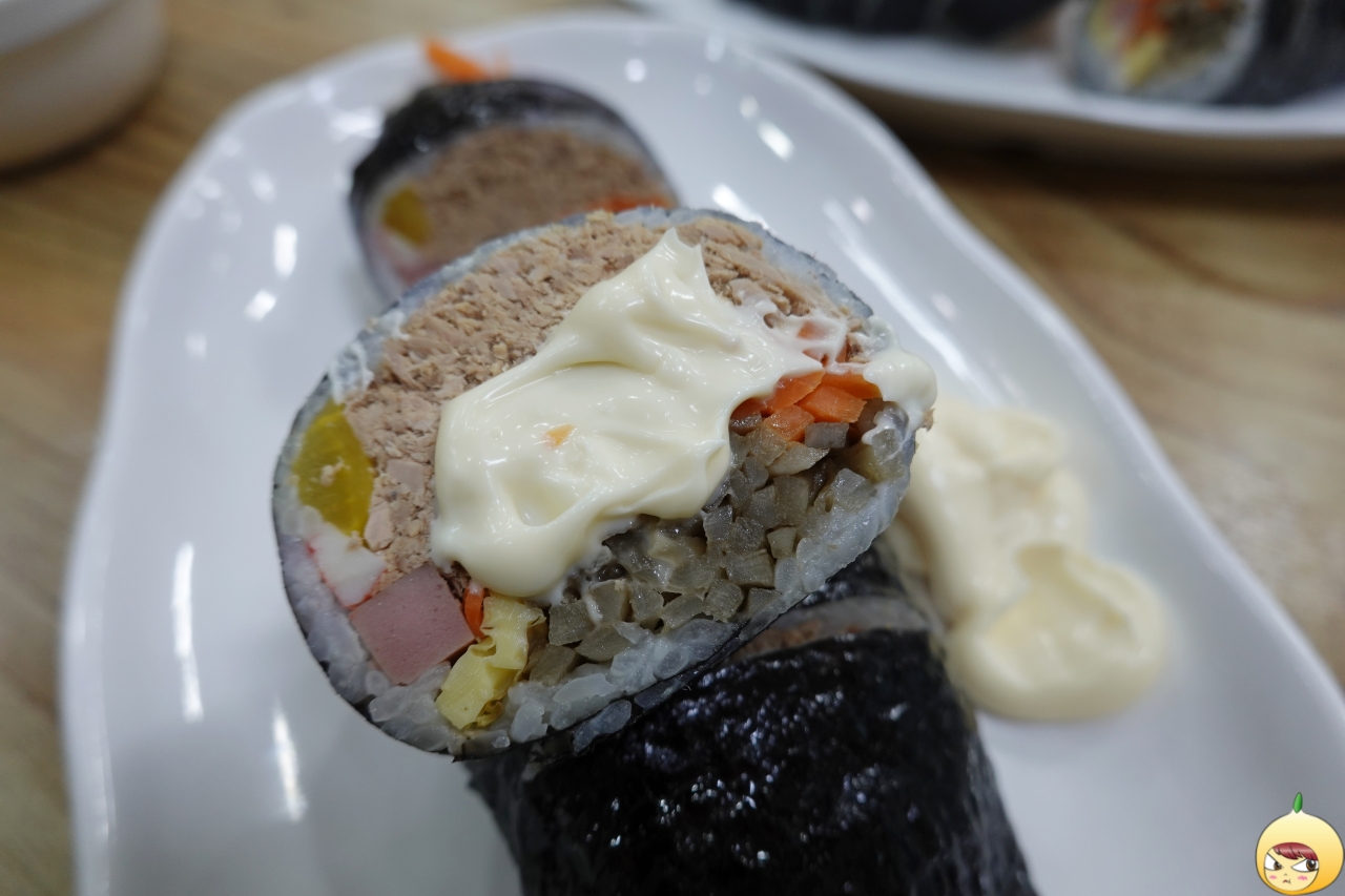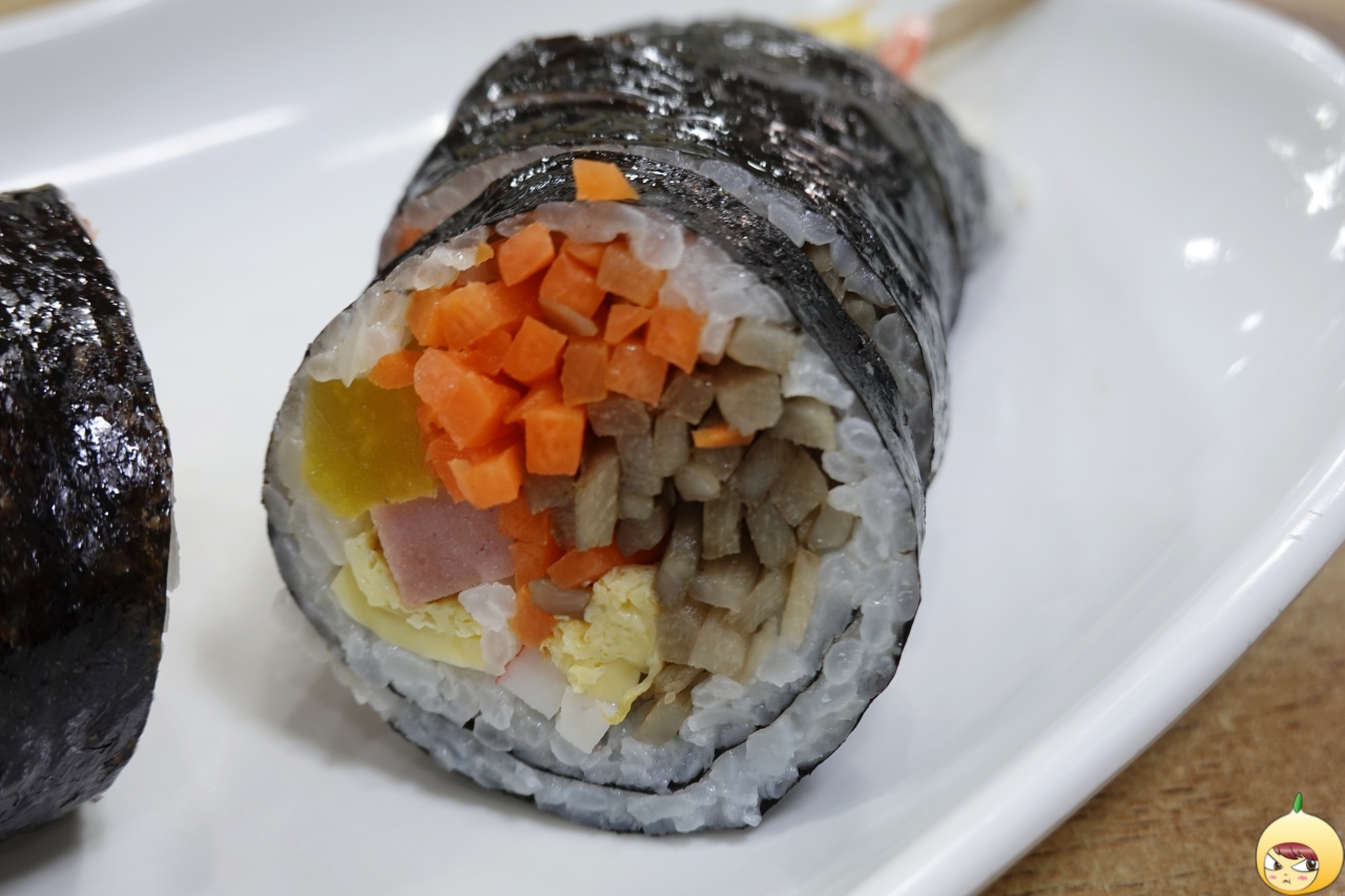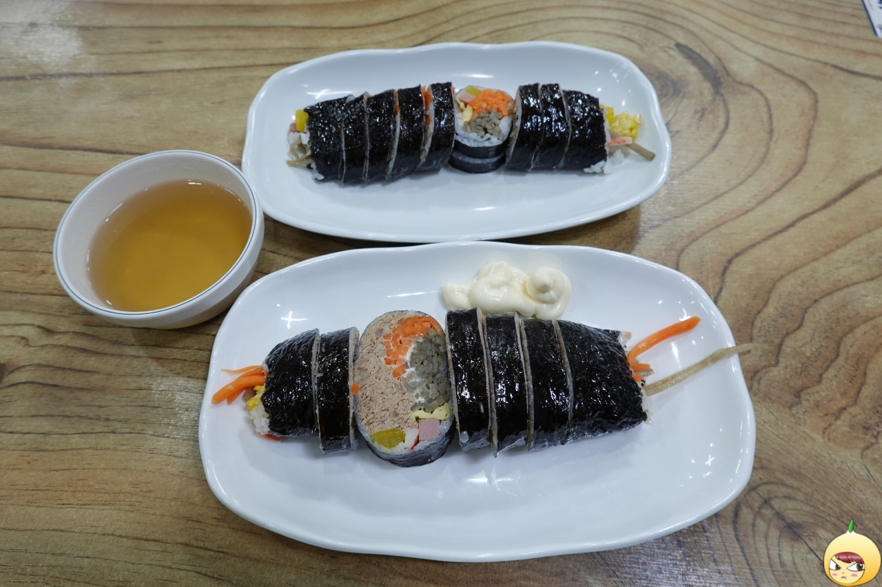 보통 사이즈의 이공김밥은 참치를 뺀 다른 속재료가 들어있다. 우엉과 당근이 많은 지분을 차지하고 있다 보니, 아삭한 식감은 자칫 평범해 보이는 김밥의 맛을 살렸다. 목넘김 후 찾아오는 우엉의 풍미는 김밥을 계속 먹게 만든다.