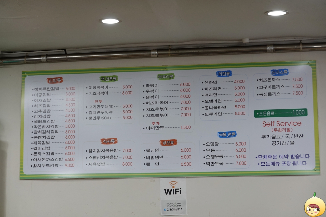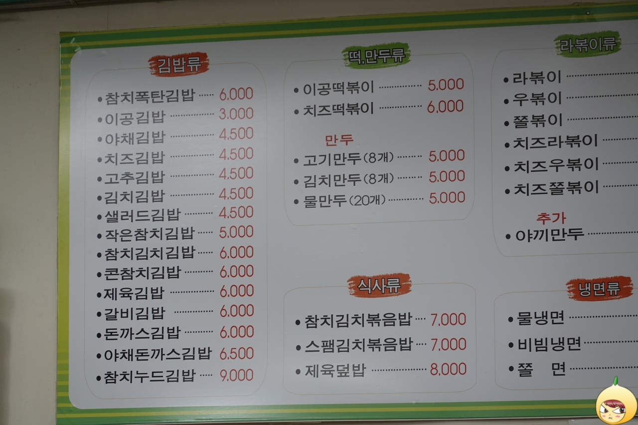 라볶이도 괜찮다고 하지만, 참치폭탄김밥이랑 먹기에는 양이 너무 많다. 대학가 분식집이라 양을 많이 준다고 해서, 포장이 어려운 라볶이는 포기했다. 혼밥이지만, 하나는 아닌 듯 싶어 참치폭탄김밥(6,000원)과 이공김밥(3,000원)을 주문했다. 안암동은 자주 갈 수 없는 동네이고, 멀리서 왔는데 하나만 먹을 수 없기 때문이다. 그리고 김밥은 남으면 포장이 가능하다.