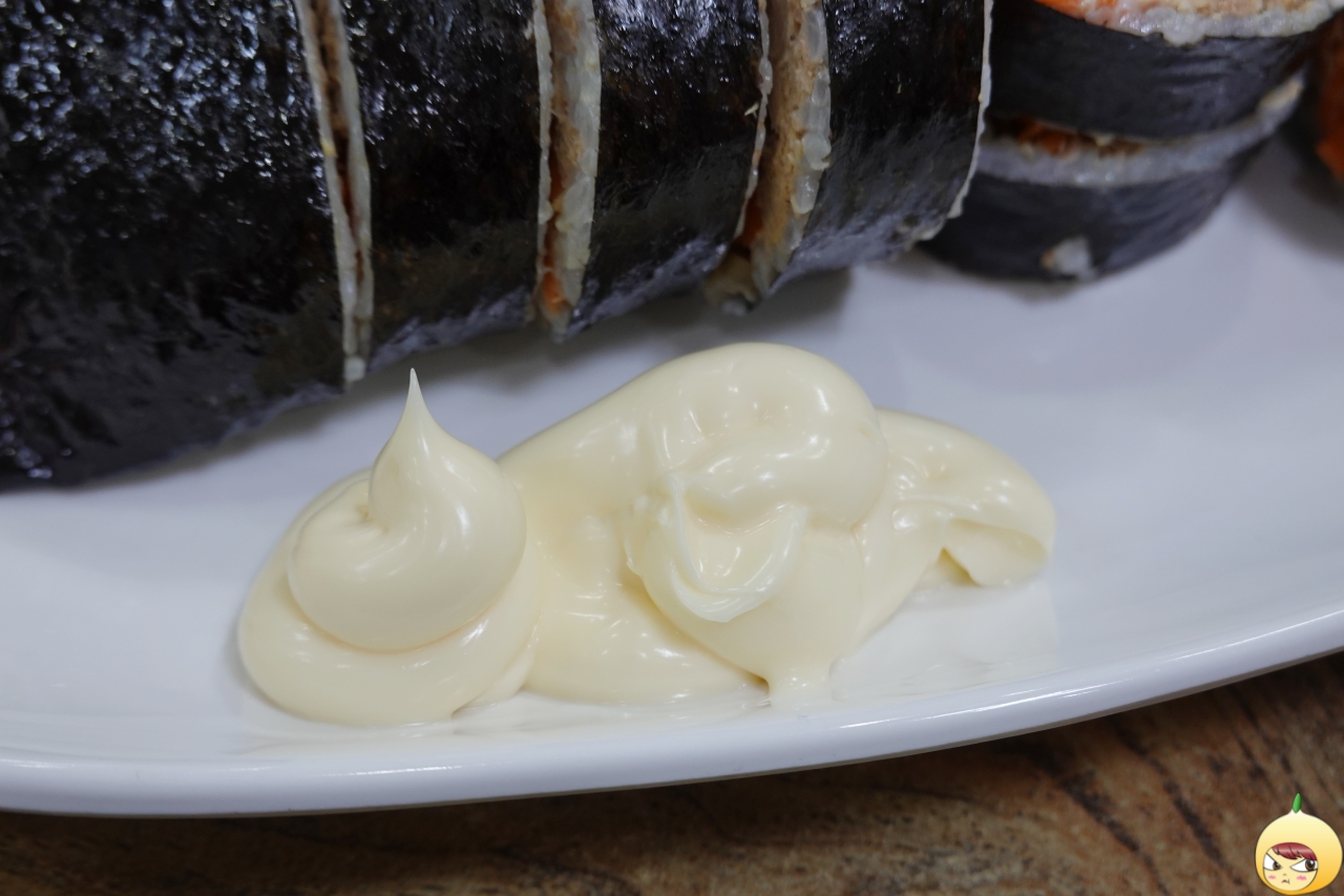 김밥 속에 마요네즈가 있지만, 접시에 따로 담아서 준다. 이유는 간단하다. 김밥만 먹으면 겁나 퍽퍽하기 때문이다. 특히 정중앙에 있는 부분은 한 입에 넣기도 힘들지만, 마요네즈를 추가하지 않으면 저작운동이 너무너무 힘들다.