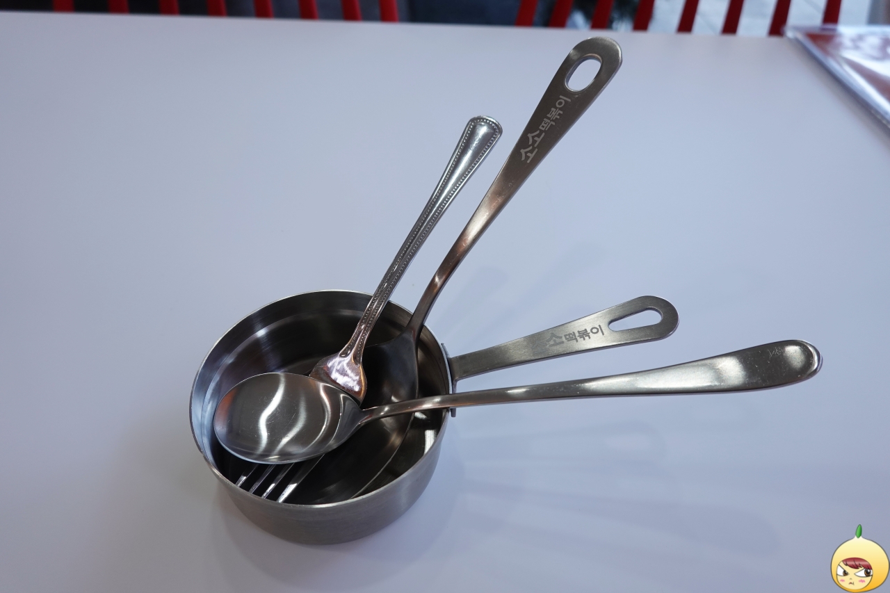 떡볶이가 나오길 기다리면서 셀프바에서 도구를 챙겨왔다. 앞접시라 할 수 있는 손잡이가 있는 오목한 그릇에, 주걱 같은 커다란 숟가락 그리고 일반 크기의 숟가락과 포크다. 참, 젓가락도 있다. 혼밥이라서 덜어먹을 필요가 없는데, 오목한 그릇은 괜히 가져왔다.