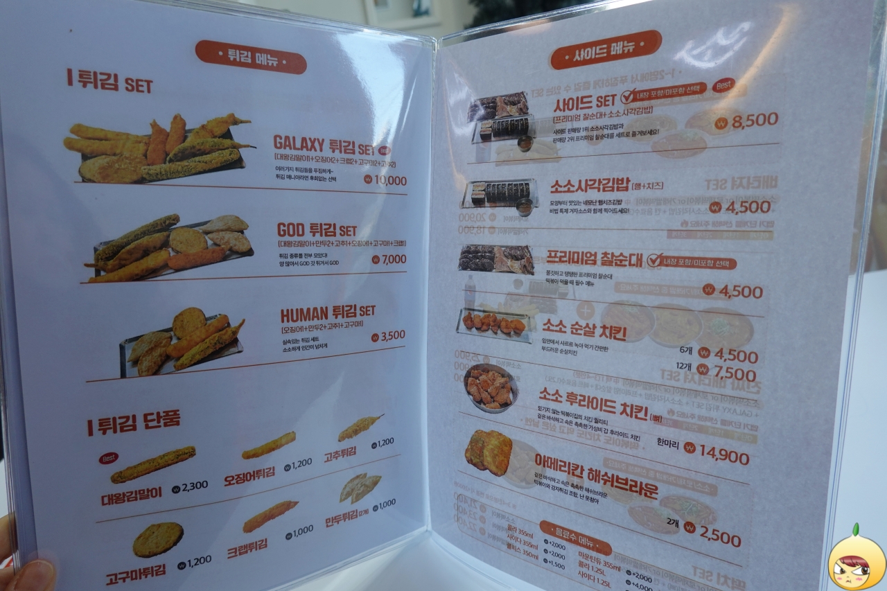 토핑을 추가할까 하다가, 떡볶이와 튀김은 함께 가야 하므로, 오징어 + 만두2 + 고추1 + 고구마가 나오는 휴먼튀김세트(3,500원)을 주문했다.