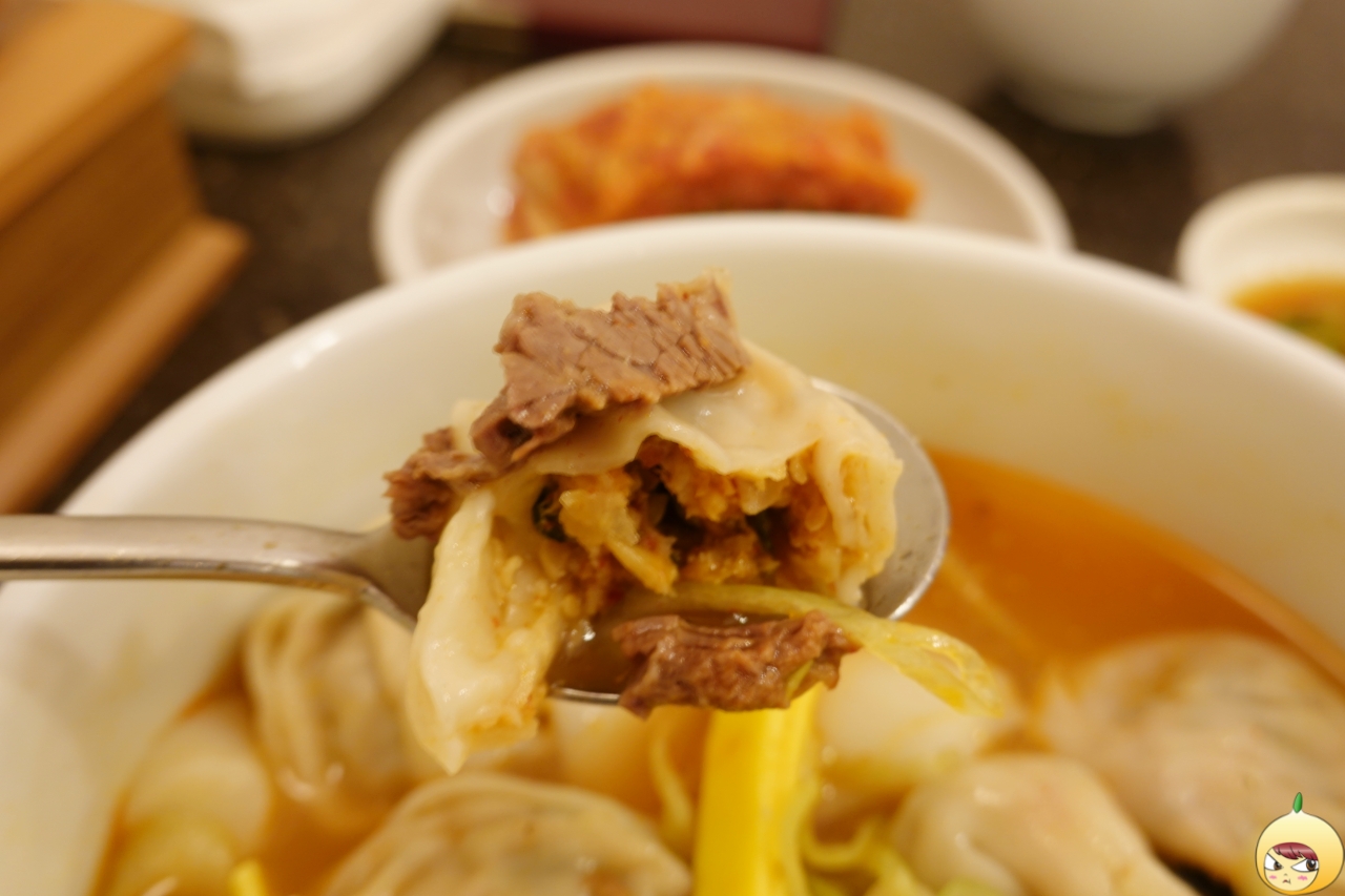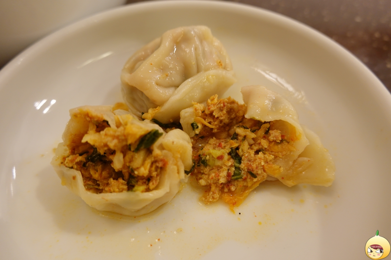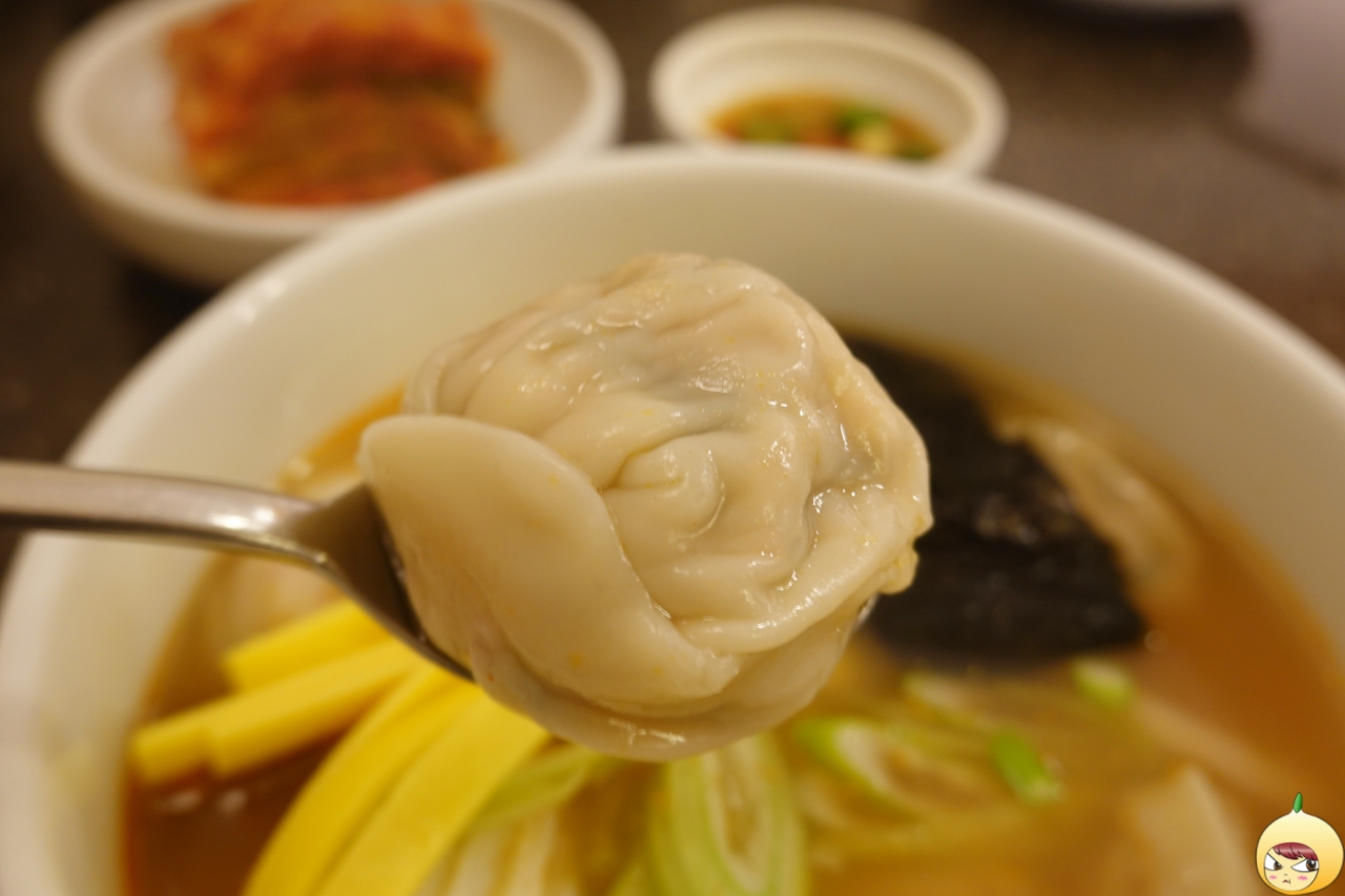 당연히 고기만두인 줄 알았는데 김치만두이다. 하지만 이북식 만두답게 자극적이지 않고 슴슴하다. 한 입에 다 먹을 수 있지만, 뜨거워서 반으로 잘라서 먹어야 입천장을 보호할 수 있다. 만두피는 전체적으로 얇은 듯 하지만, 접힌 부분은 두께감이 느껴진다.