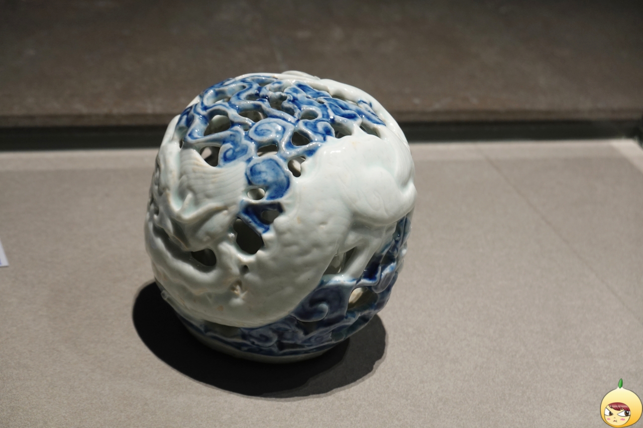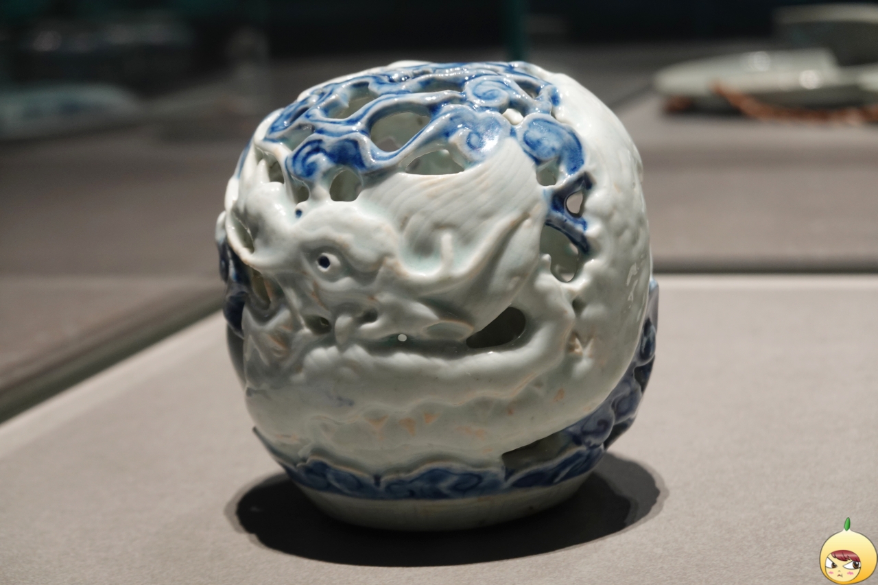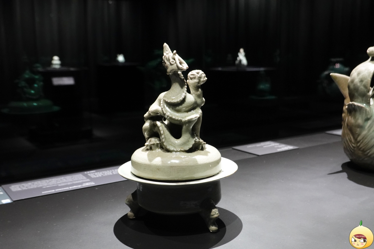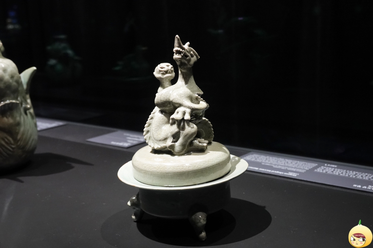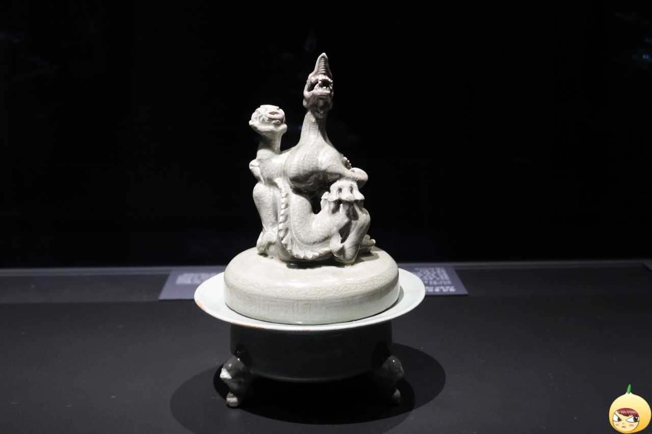 향로 뚜껑 위에 용이 올라앉아 여의주를 움겨쥐고 머리를 치켜올린 채 날카로운 이빨을 드러내고 있다. 기다란 몸통은 똬리를 틀어 앉았고 상체는 꼿꼿이 세우고 있다. 음각선으로 장식된 비늘과 주름, 갈기 장식 사이로 푸른색 유약이 채워져 정교하면서도 입체적인 모습이 강조되었다.