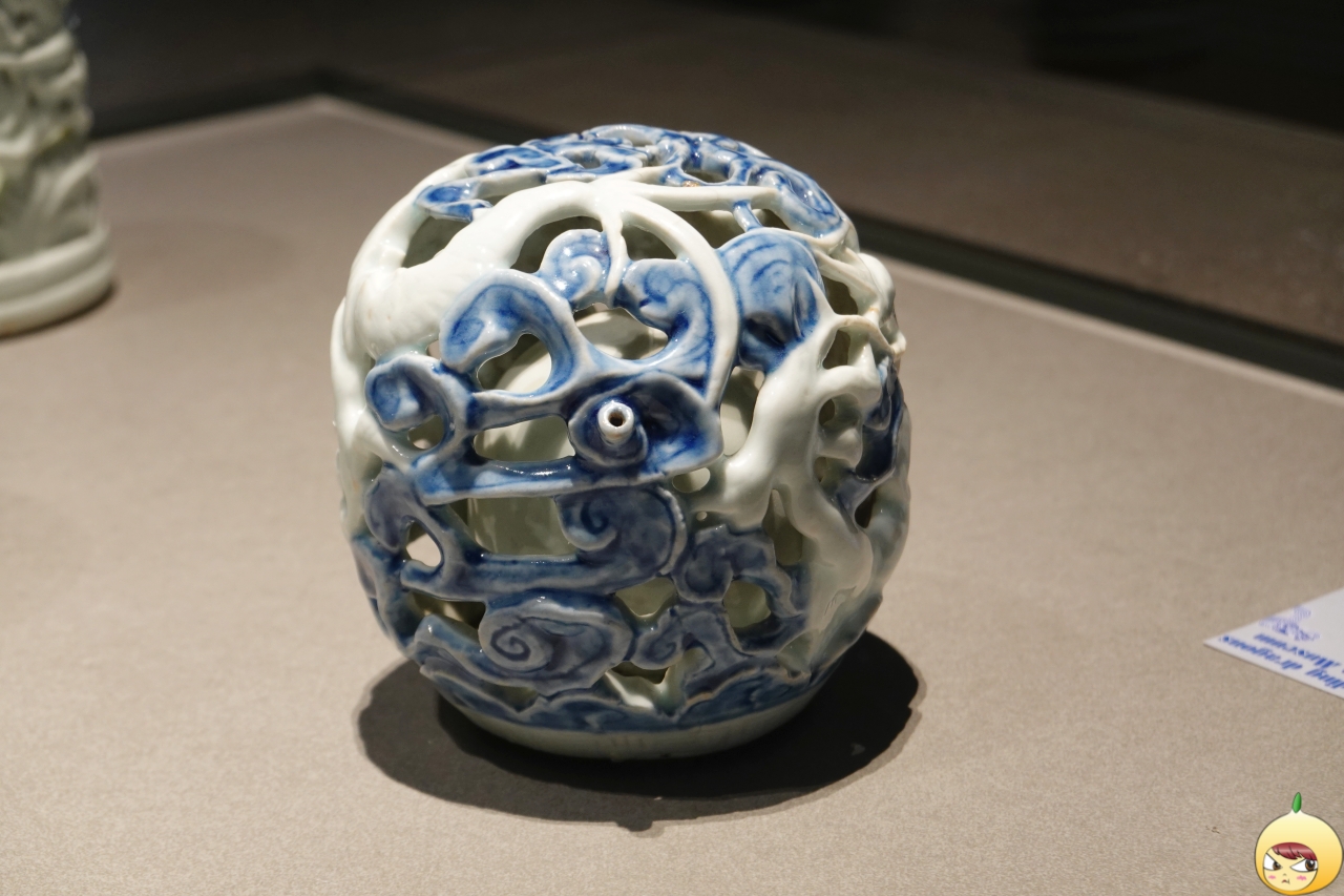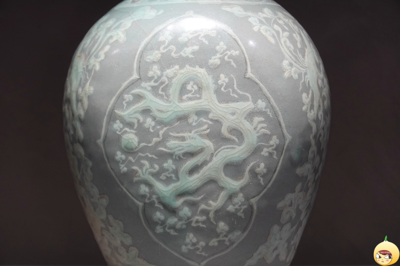 마름모꼴 꽃모양 창 안에 여의주를 쫓는 용 한 마리를 백색 상감으로 표현했다. 청자의 푸른빛이 하늘이 된 것처럼, 흰색 용이 몸을 틀며 역동적으로 움직이고 있다. 능화형 창을 경계로 바깥쪽에는 봉황과 넝쿨을, 안쪽에는 용과 구름을 가득 장식해 초현실적인 세계를 담았다.