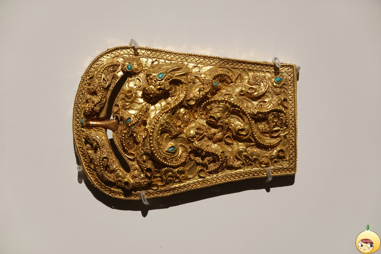 금관을 두들겨 허리띠 고리(버클)을 만들고, 표면을 금알갱이 수천 개와 금실로 용 일곱 마리로 장식했다. 가운데 큰 용이 있고, 그 주위에 작은 용 여섯 마리가 있다. 금실을 나선형으로 말아 용의 코를 특징적으로 나타냈으며 곳곳에 청록색 터키석을 박아 넣어 화려함을 더했다.
