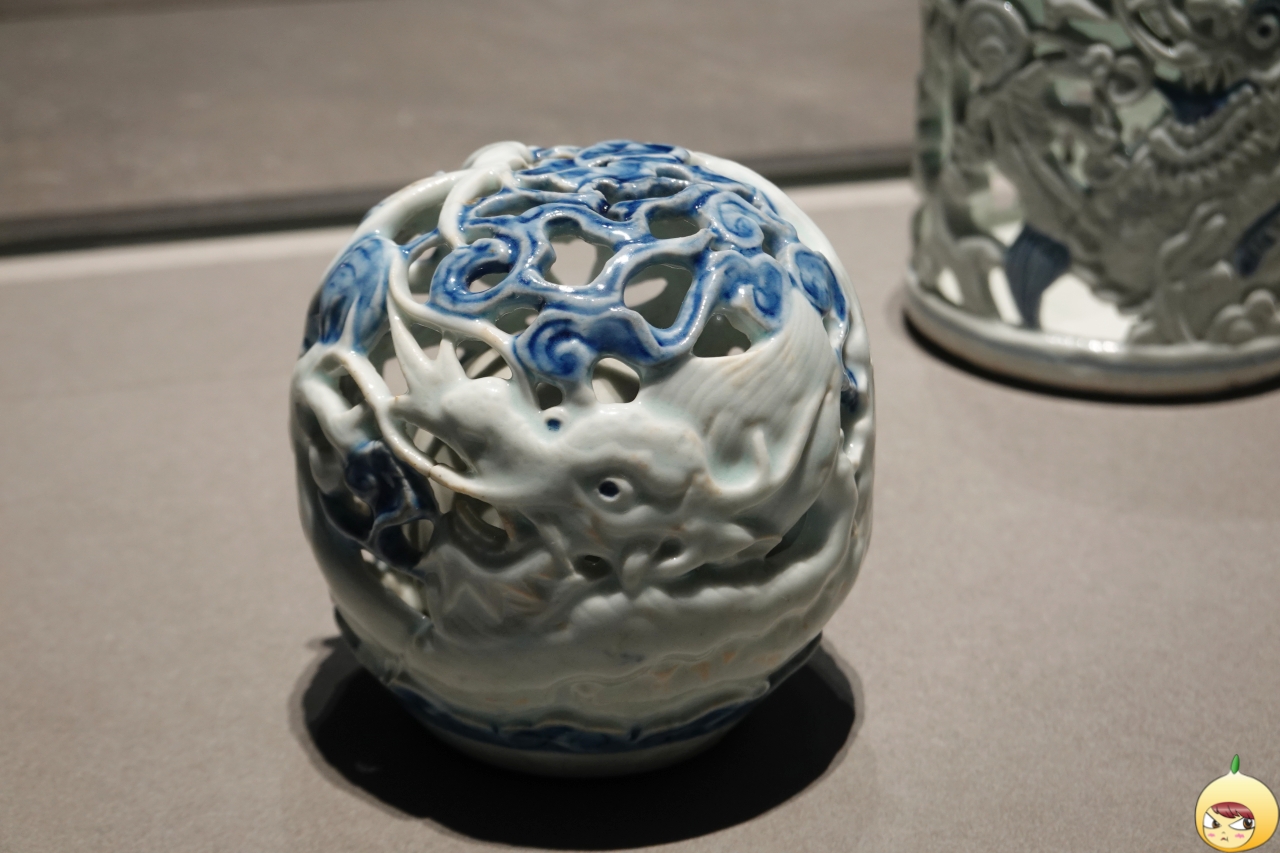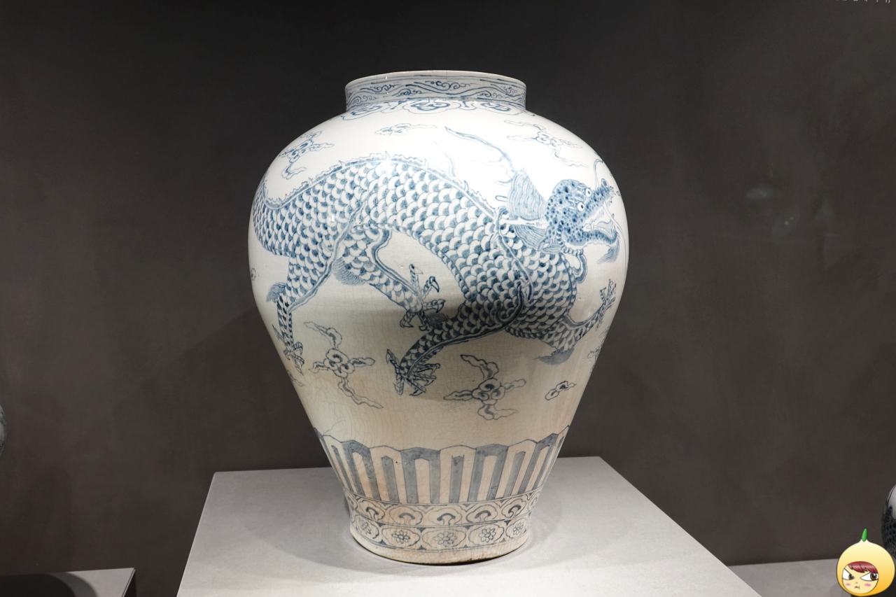 백자의 흰 면을 도화지 삼아 푸른 안료로 용 두 마리를 연이어 그렸다. 입을 벌리고 앞으로 낭가는 용은 마치 웃는 듯 보인다. 용의 얼굴을 자세히 그리고 연하게 칠한 뒤, 진한 청색으로 점을 찍어 문양 등을 나타냈다.