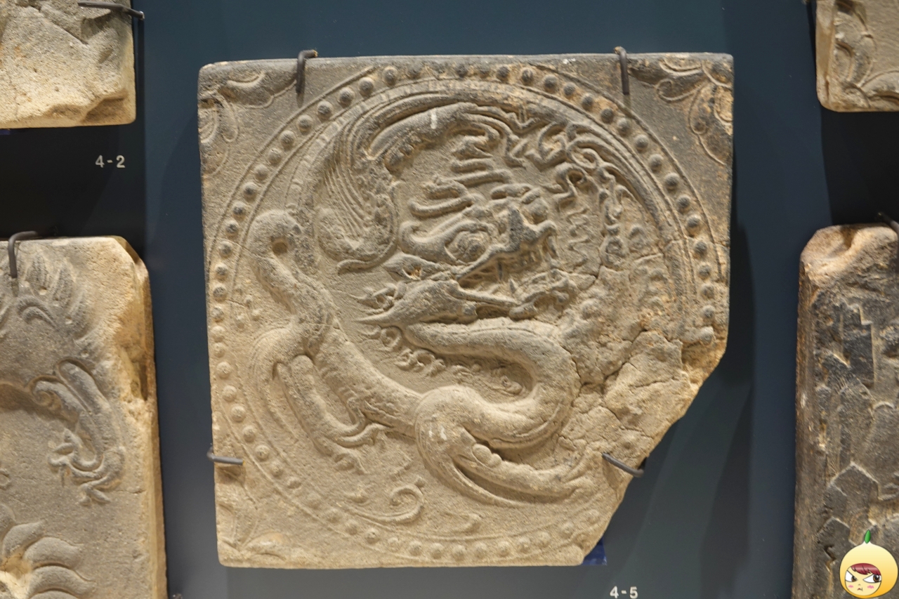 두께 4cm인 정사각형 무늬 벽돌로 네 귀의 측면에 홈이 있어 서로 연결할 수 있다. 출토 당시 바닥에 다른 무늬 벽돌과 함께 일렬로 발견됐다고 한다. 벽돌 안 둥근 테두리 안에 몸을 S자로 뒤틀고 있는 용 한 마리가 있다. 동그란 두 눈을 부릅뜨고 입을 크게 벌렸는데 이빨은 날카롭다. 용 주변에는 구름이 있어 용이 하늘을 날고 있음을 알 수 있다.