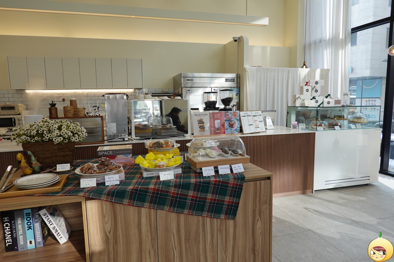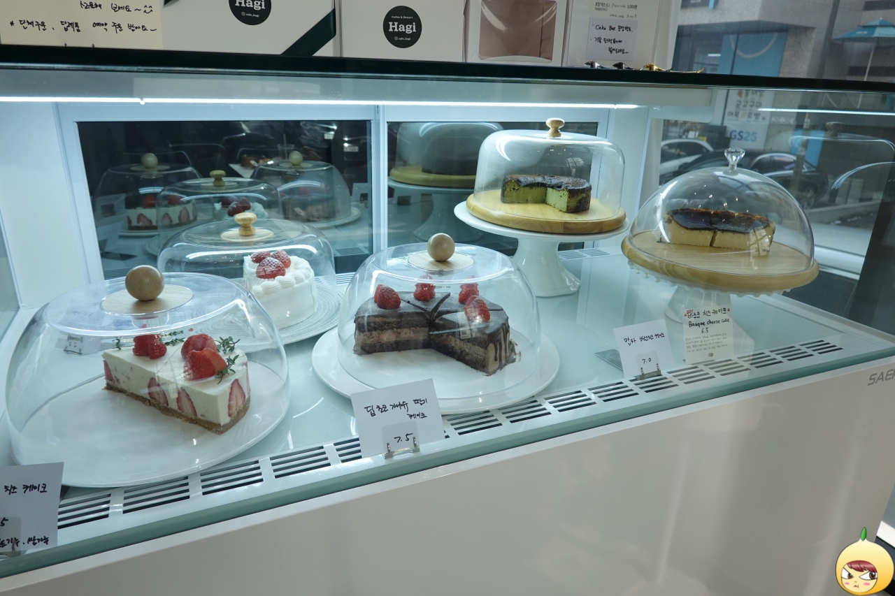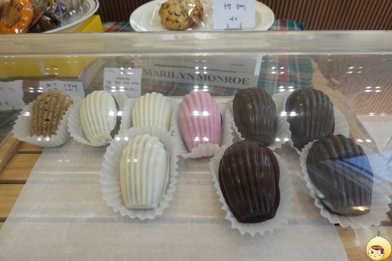 디저트카페는 베이커리카페(빵집)와 달리 종류가 많지 않으니 진열대가 아담하다. 앞쪽은 쿠키와 휘낭시 등이 있고, 뒤쪽 유리 진열대에는 케이크류가 있다. 나머지 공간은 음료를 만드는 공간인 줄 알았는데, 모든 디저트는 주인장이 직접 만든다고 한다. 음료를 만드는 공간이 넓다고 생각했는데, 다 이유가 있었다.