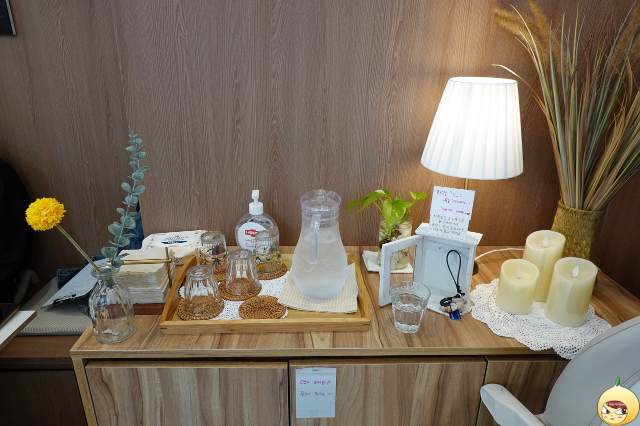 난생처음 망우동에 왔는데 떡볶이 하나만 먹고 갈 수는 없다. 사실을 떡볶이로만 1, 2차를 하고 싶었으나, 위대하지 못해서 디저트 카페 하기에 왔다. 1층이 아니라 1, 5층이라고 해야 할까나? 층고가 높아서 답답하지 않고, 은은한 조명과 화려하지 않은 소품으로 인해 분위기가 아늑하다. 참, 커다란 사진 액자 아래에 테이블이 있는데, 사람이 꽉 차서 담지 못했다. 그 옆에는 화장실 키보관함과 물은 셀프다.