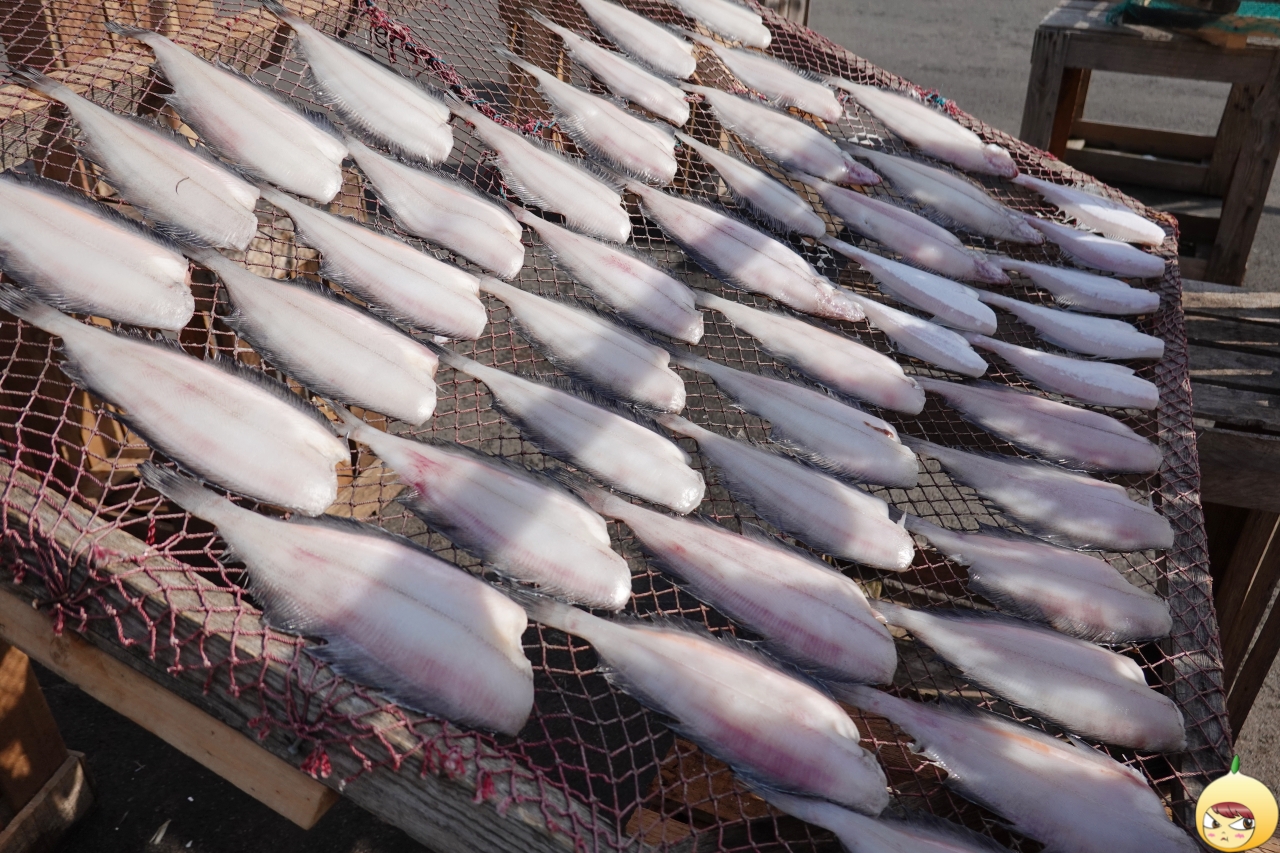 용가자미는 방어진항의 대표 해산물이자 제철이다 보니 점포마다 가자미를 말리느라 한창이다. 가자미는 생물로만 먹었기에 이런 풍경이 낯설다. 그런데 제철이고 산지이다 보니 잡히는 양이 어마어마할 거다. 생물로 팔기도 하겠지만, 다 소화할 수 없으니 건조는 선택이 아니라 필수이지 않을까 싶다.