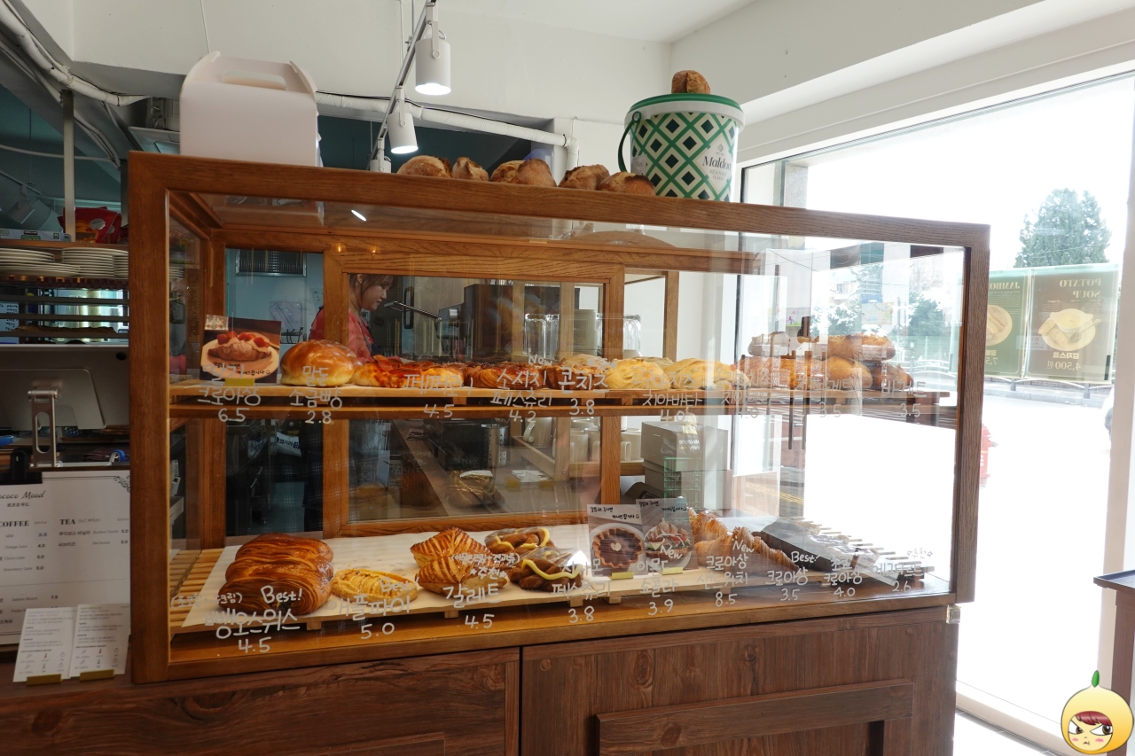 미술관이 아니라 베이커리카페에 왔는데 가장 중요한 빵이 보이지 않는다. 저기는 주방이자 카운터이자 음료를 만드는 곳인데 빵도 있다. 나무로 만든 작은 유리진열대와 저 끝에 보이는 냉장고에 로코코무드 주인장이 만든 빵이 들어있다.