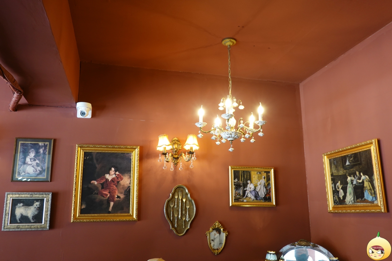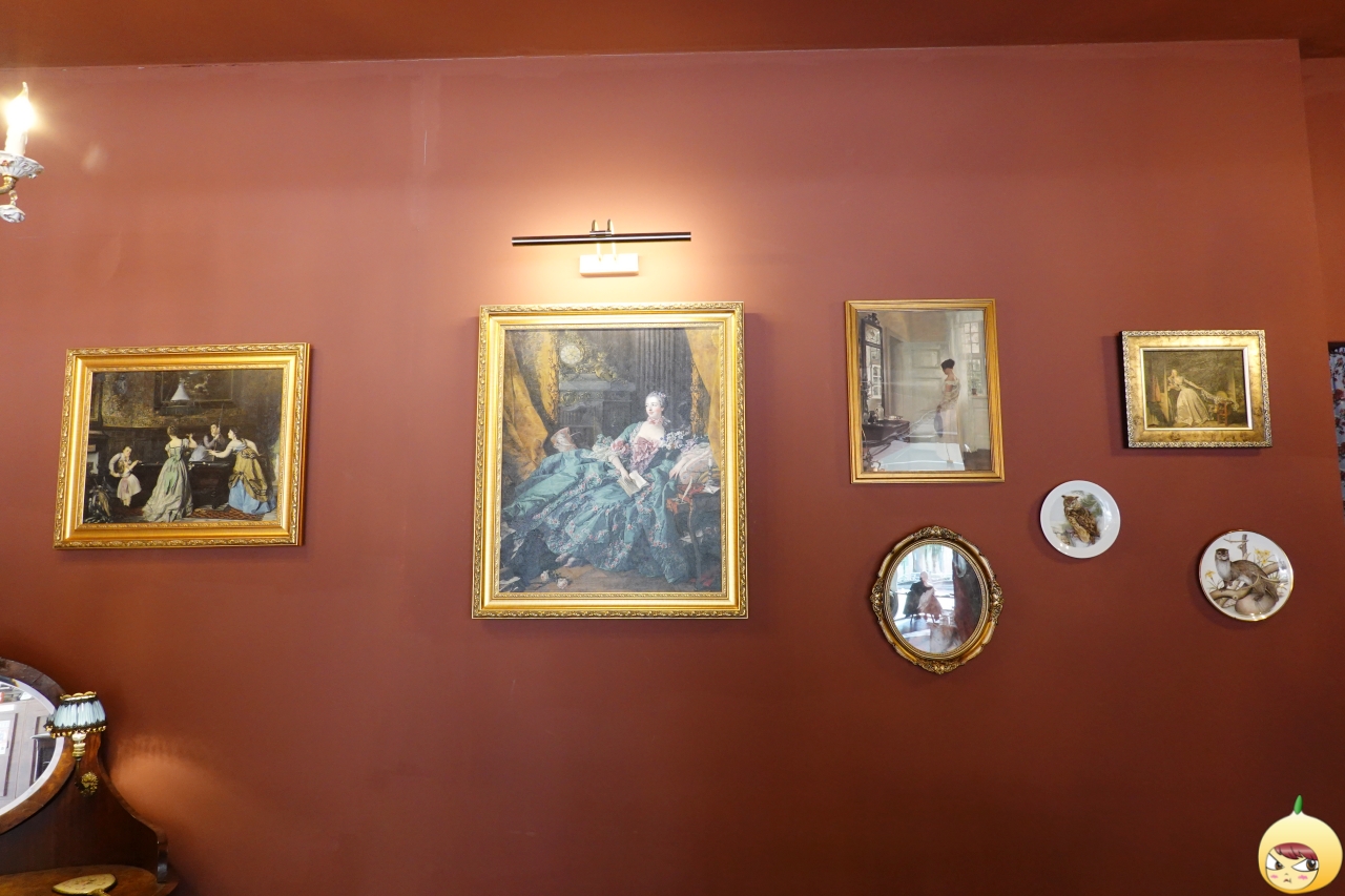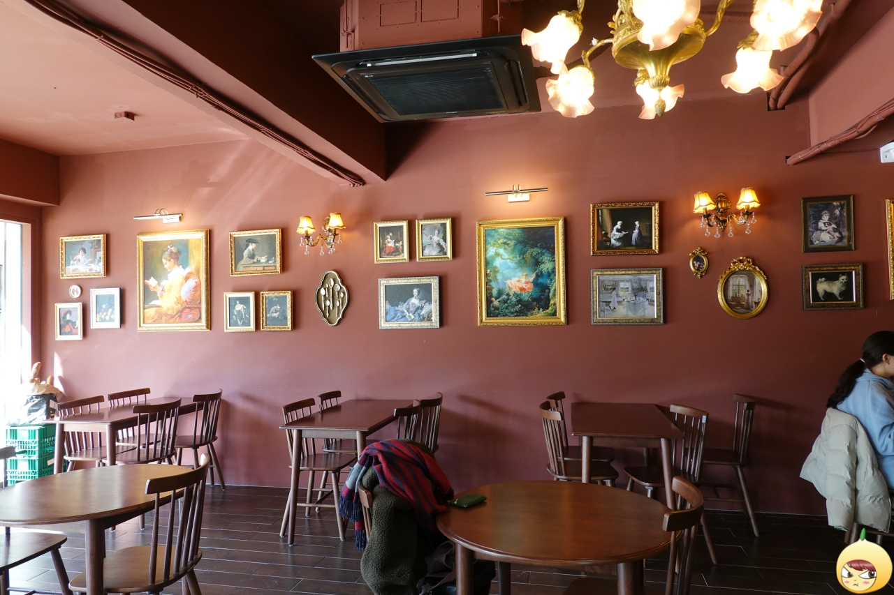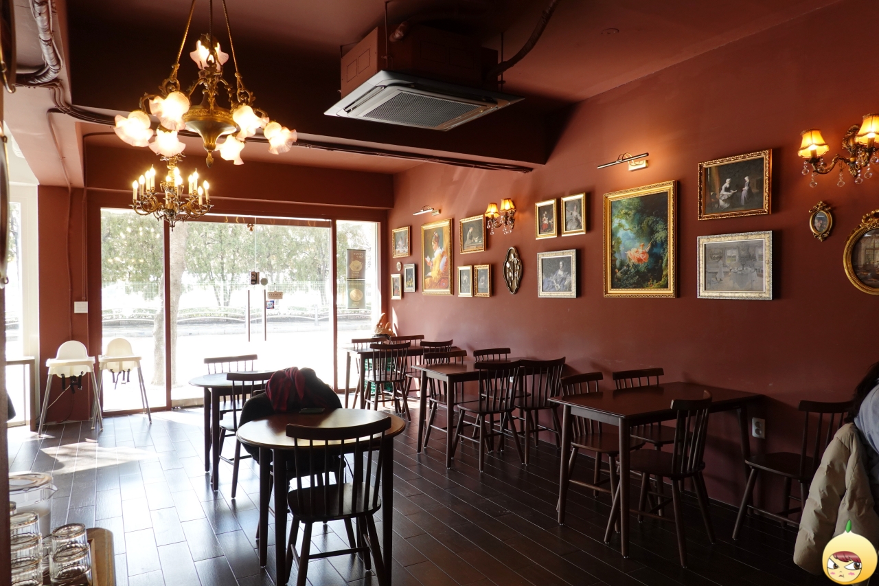 밖에서 봤을때는 여느 동네에 있는 아담하고 평범한 카페인 줄 알았는데, 문을 열자마자 딴 세상에 온 듯 당황했다. 첫 반응은 빵집이야? 미술관이야? 했다가, 벽면을 가득 채우고 있는 그림을 보고 있으니 돈 많은 수집가의 집에 몰래 온 손님 같다. 당연히 진품은 아니겠지만, 미술관 컨셉이 매우 몹시 맘에 든다.