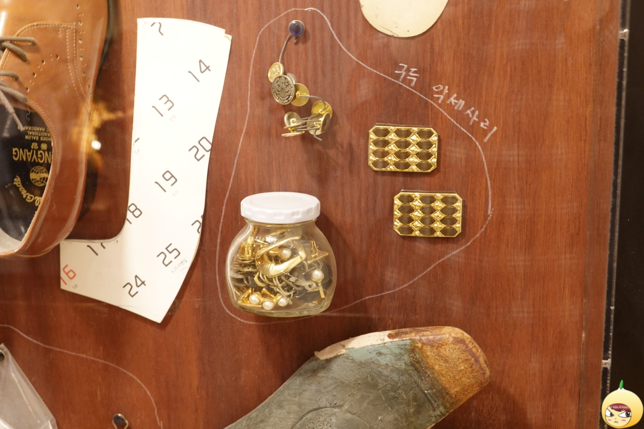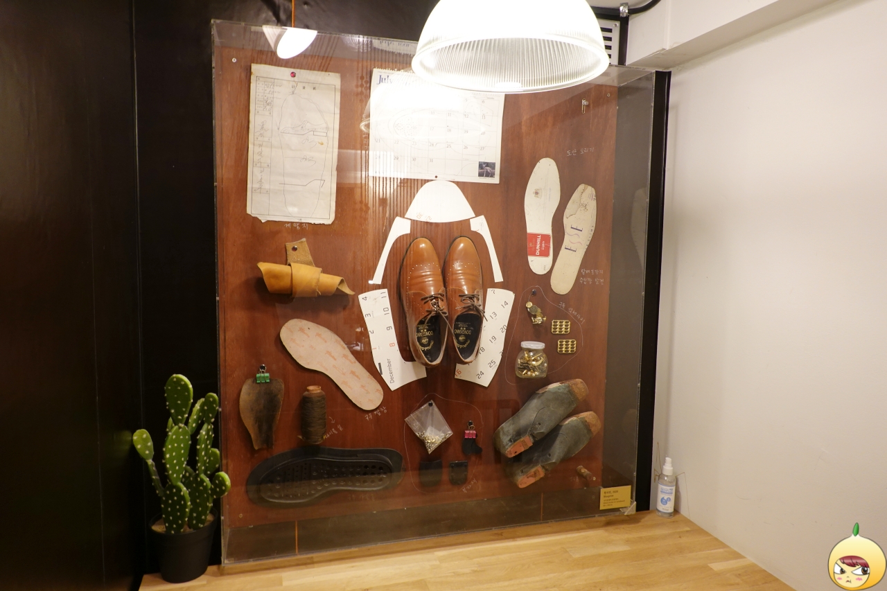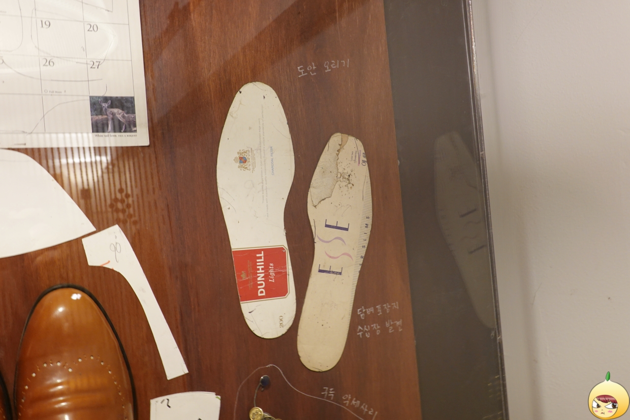 수제구두를 만드는데 필요한 재료를 모아 놓았다. 아까 도구 진열장보다 나은 점이라면, 이름표는 있다. 담배포장지로 도안을 만들고, 계랑지에는 어떤 이의 발도장과 원하는 구두 디자인이 그려져 있다. 구두깔창과 실, 부자재와 액세서리에 이어, 완성된 구두와 그 구두를 만들기 위해 먼저 제작한 구두골도 있다.